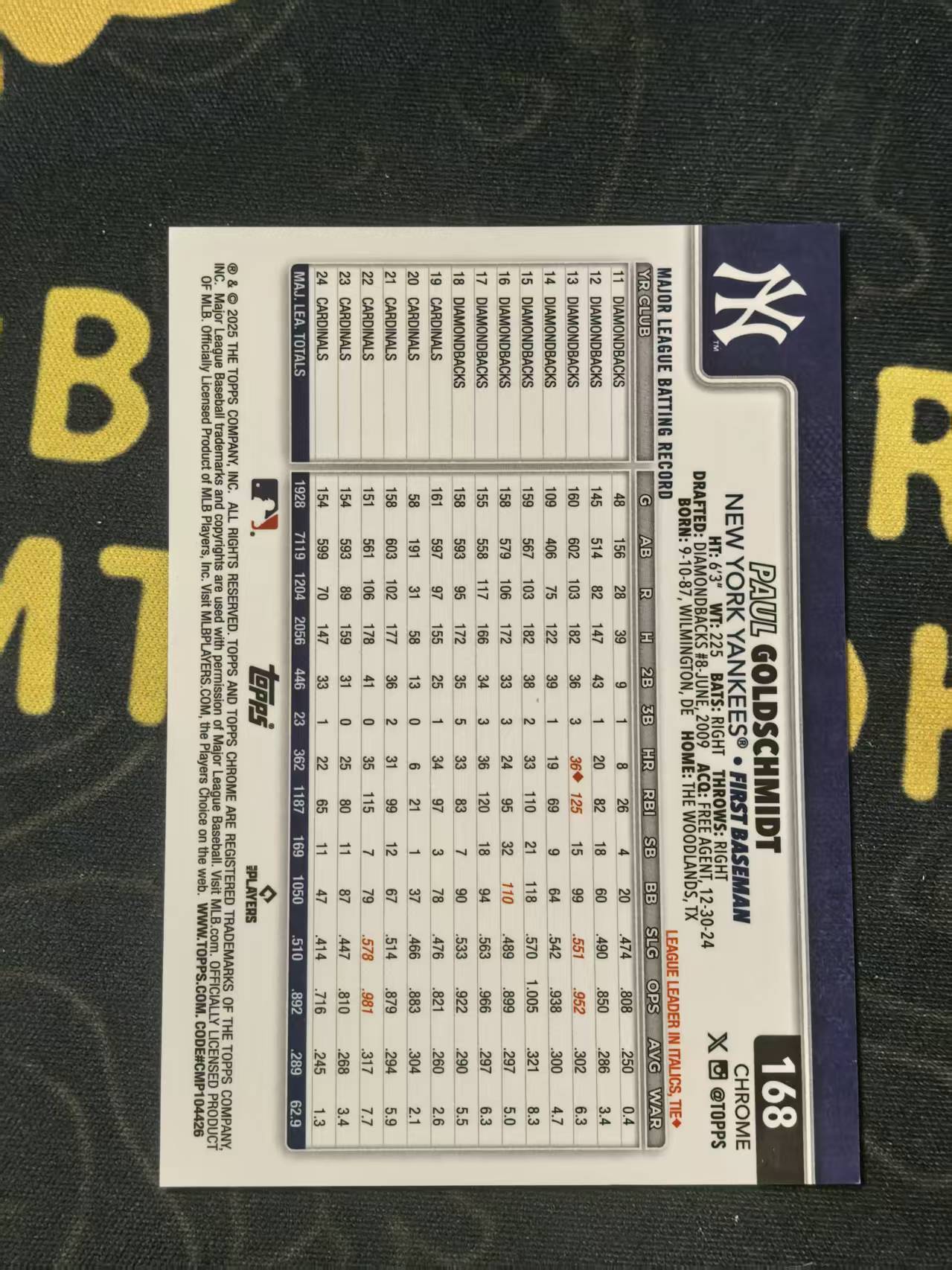 2025 Topps Chrome Paul Goldschmidt 纽约扬基 保罗 戈尔德施密特 073/250编 紫折 收藏必备 专收必备