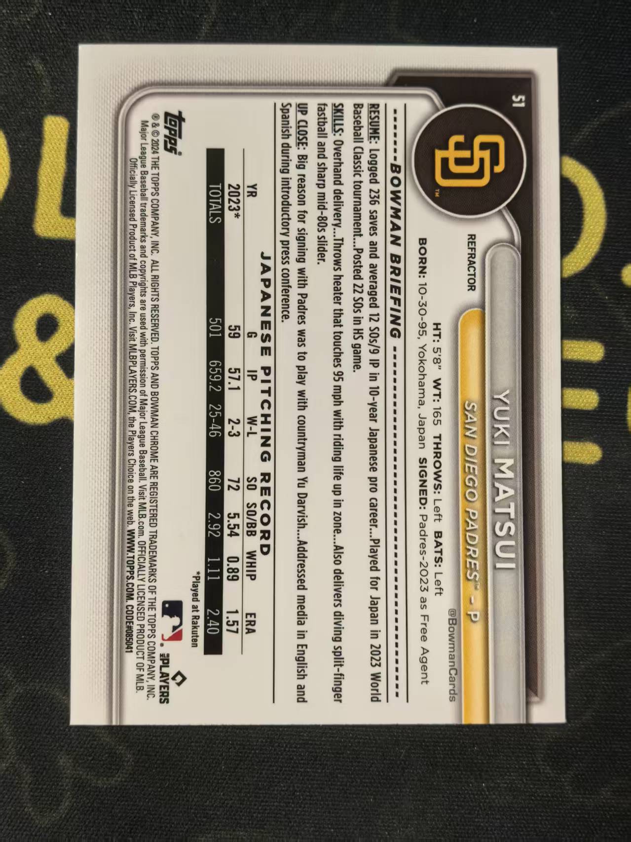 2024 Topps Bowman Chrome Yuki Matsui RC 松井裕树 新秀 教士 105/499编 银折 收藏必备 专收必备