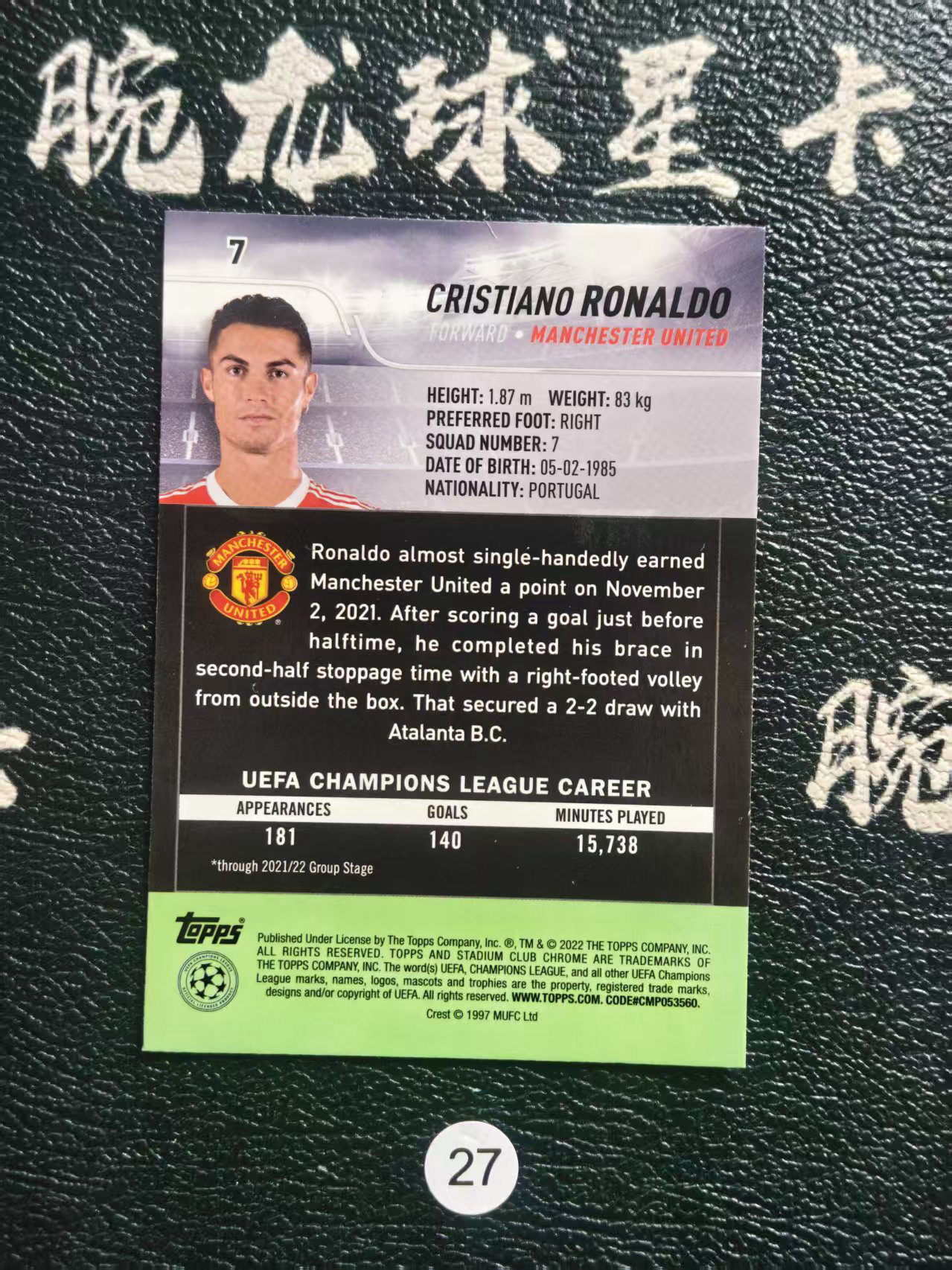 2022 【腕龙拍卖 接代卖】 腕龙E总AG3 Topps Stadium Club 欧冠 竞技场 C罗 皇家马德里 皇马 曼联 葡萄牙 base CRISTIANO RONALDO 卡品如图