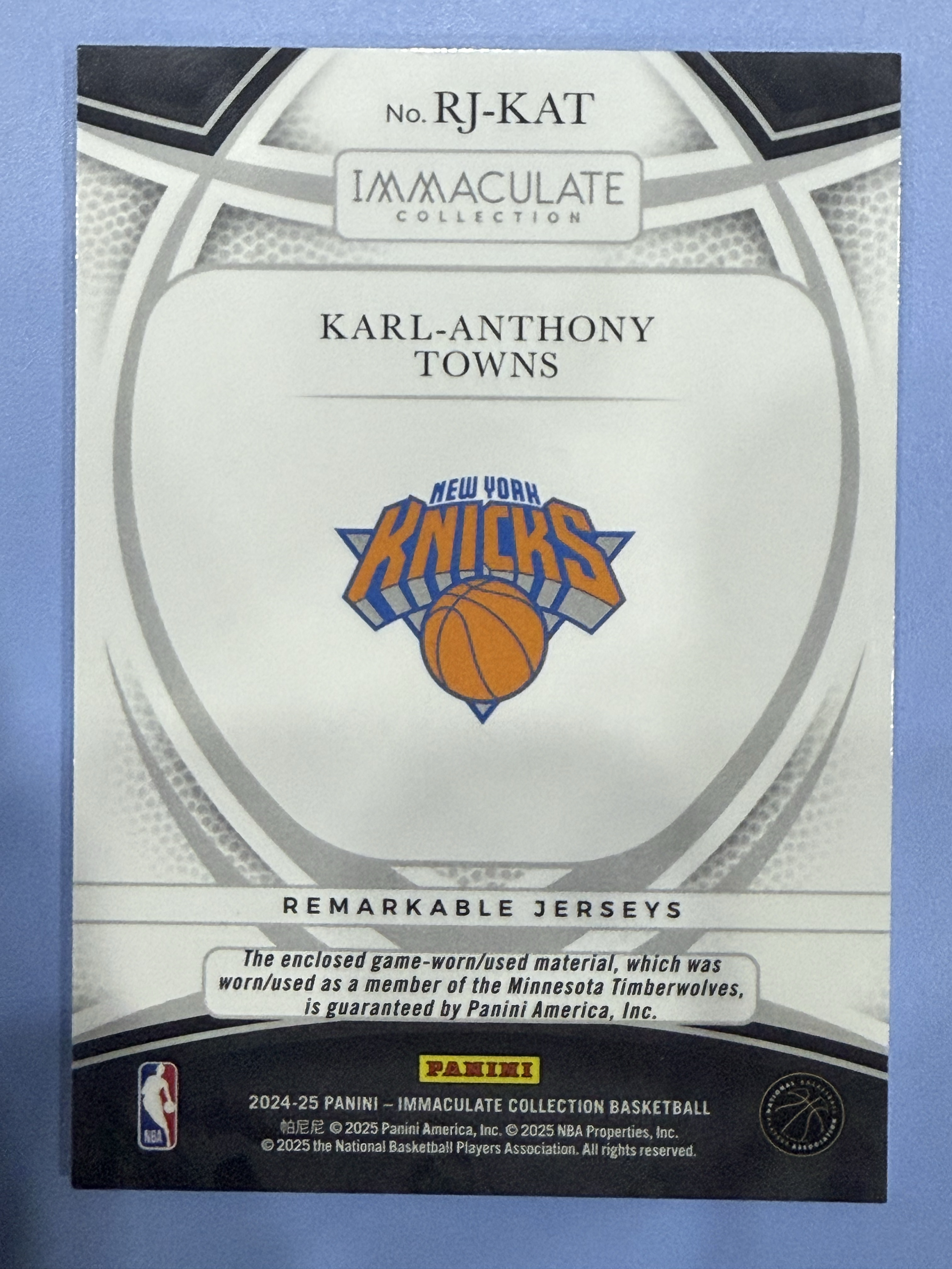 2024-25 Panini Immaculate Karl Anthony Towns 99编 亲穿 落场 尼克斯 卡尔-安东尼 唐斯 Remarkable 球衣 卡品如图