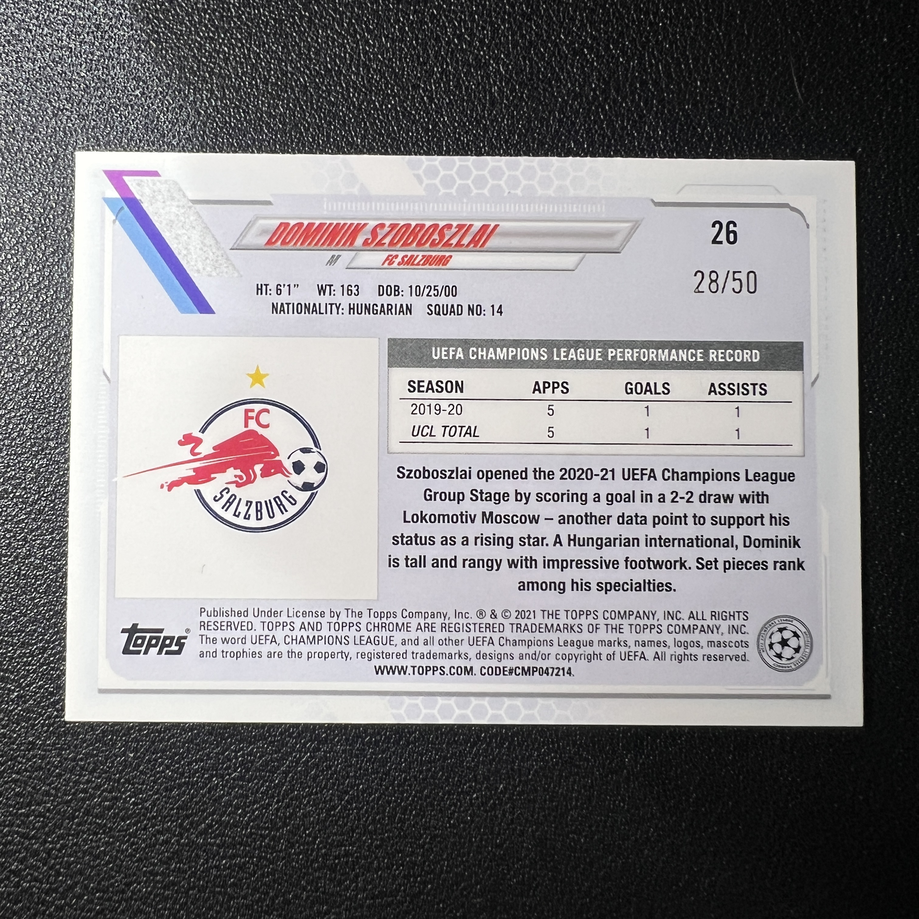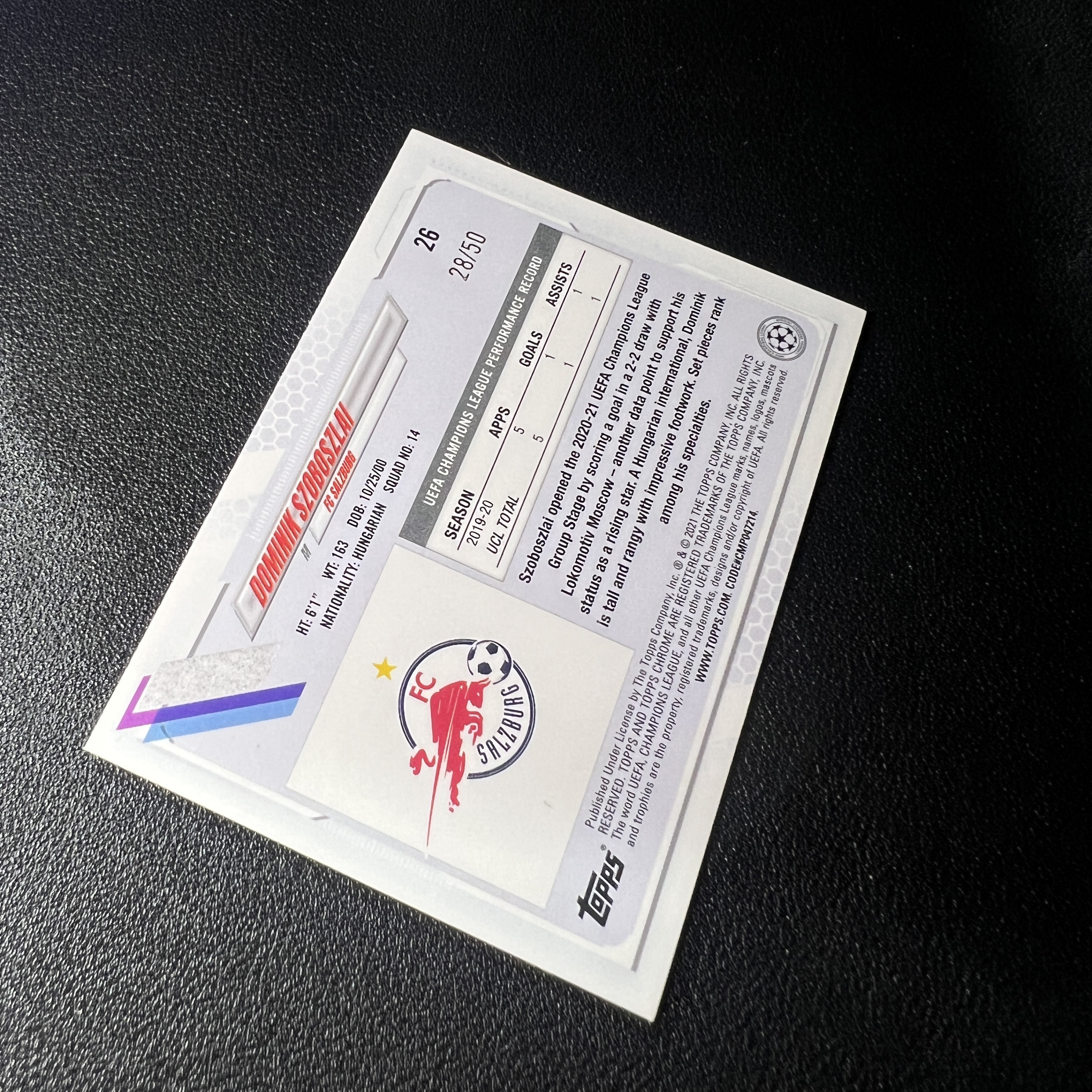 2021 Topps Chrome Dominik Szoboszlai 欧冠蓝宝石 索博斯洛伊 28/50编 低编 橙碎冰折 利物浦中场核心 又帅又能踢 轻印- SY5343