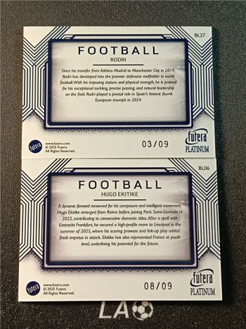 LA足球账号属于LA拍卖专注于足球的子品牌,因卡淘系统不支持跨号合并,所以分开发货计算邮费,寄售代卖咨询:laauction。卡品如图,请仔细看图,如果无图片特殊展示瑕疵均为通行品相,一般prizm optic 等系列薄卡的小划痕,国宝IMM等系列厚卡的小白边小白角,都属于通行品相。艺术家 品控勿扰。中标后请等我们合并订单再点确认付款。付款时卡淘留言说明累计或邮寄(我们会按照留言的先后顺序处理发货,请不要反复留言以免耽误给您回复)为了方便结算和卡片的累计查找,我们只合并当天的订单。邮费-顺丰(默认陆运):北京13元,非偏远外地18元,新疆西藏等偏远只发到付!超重只发到付!1000元以上的订单,建议买家自行保价,或用顺丰到付,所有快递未经保价,运输途中的损坏和丢失请于快递联系解决。(本店不支持任何普快发货,破损及丢失率太高)介意勿拍!中标可累计,累计时间2个月,每标累计金额不能超过500元,超过累计时间出现丢失或品相问题的,卡片问题由买家自行承担。累计的卡片请先付清卡款,然后卡淘上与我们联系操作,请于截标后3天转好,截标后3天未确认收到付款,一律卡淘投诉处理。