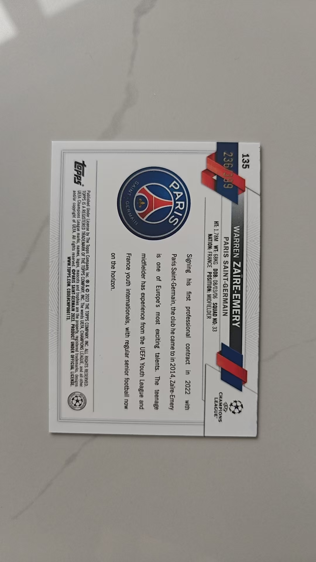 2022-23 Topps Chrome Warren Zaire-Emery RC 沃伦·扎伊尔·埃梅里 巴黎 法国 新秀 236/399 霓虹绿X射线折 欧战TC正系列
