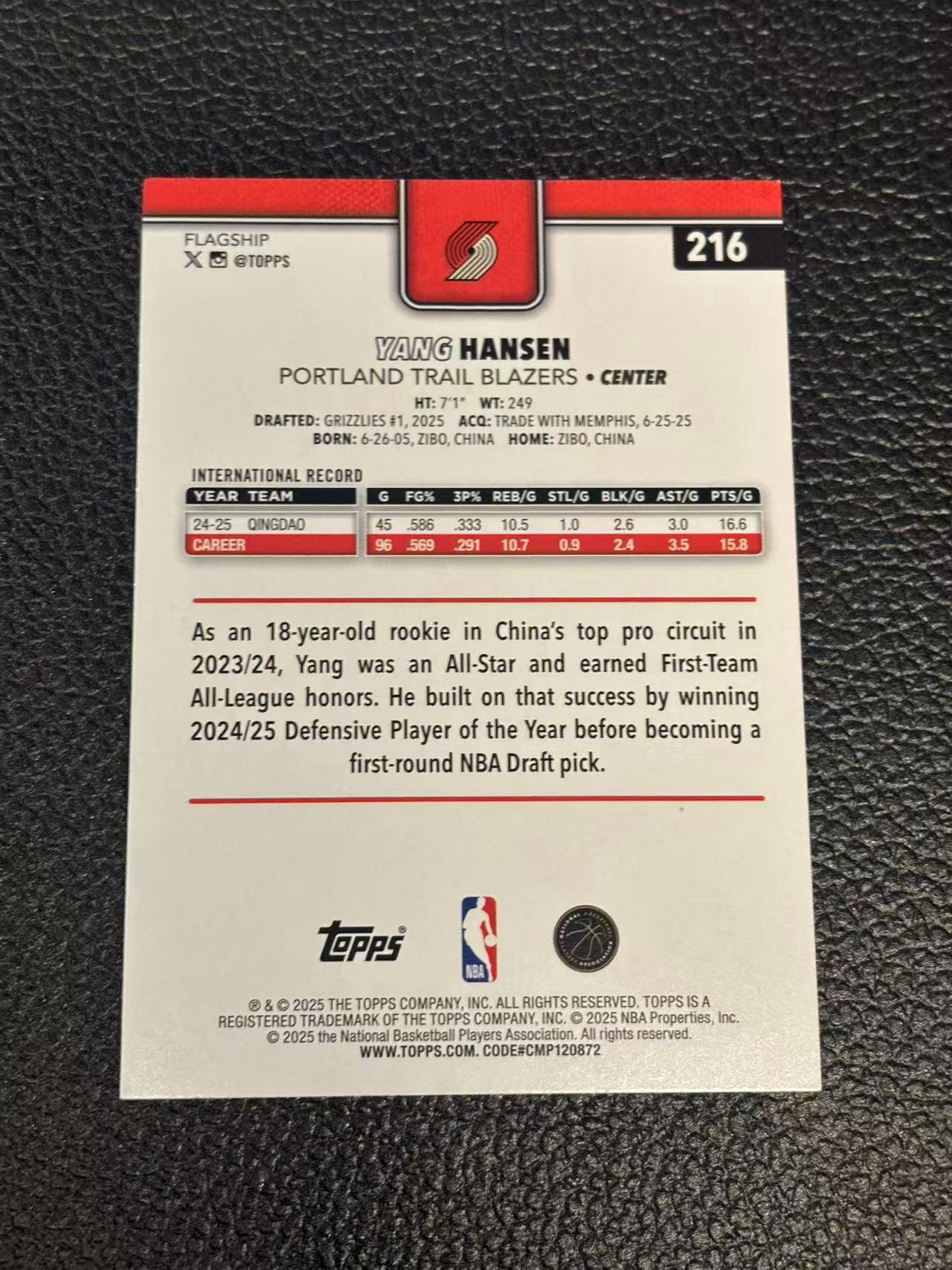 2025 Topps Basketball 杨瀚森 RC 开拓者 新秀 hansen yang 小杨 正蓝折 150编 109/150 收藏必备 卡品如图