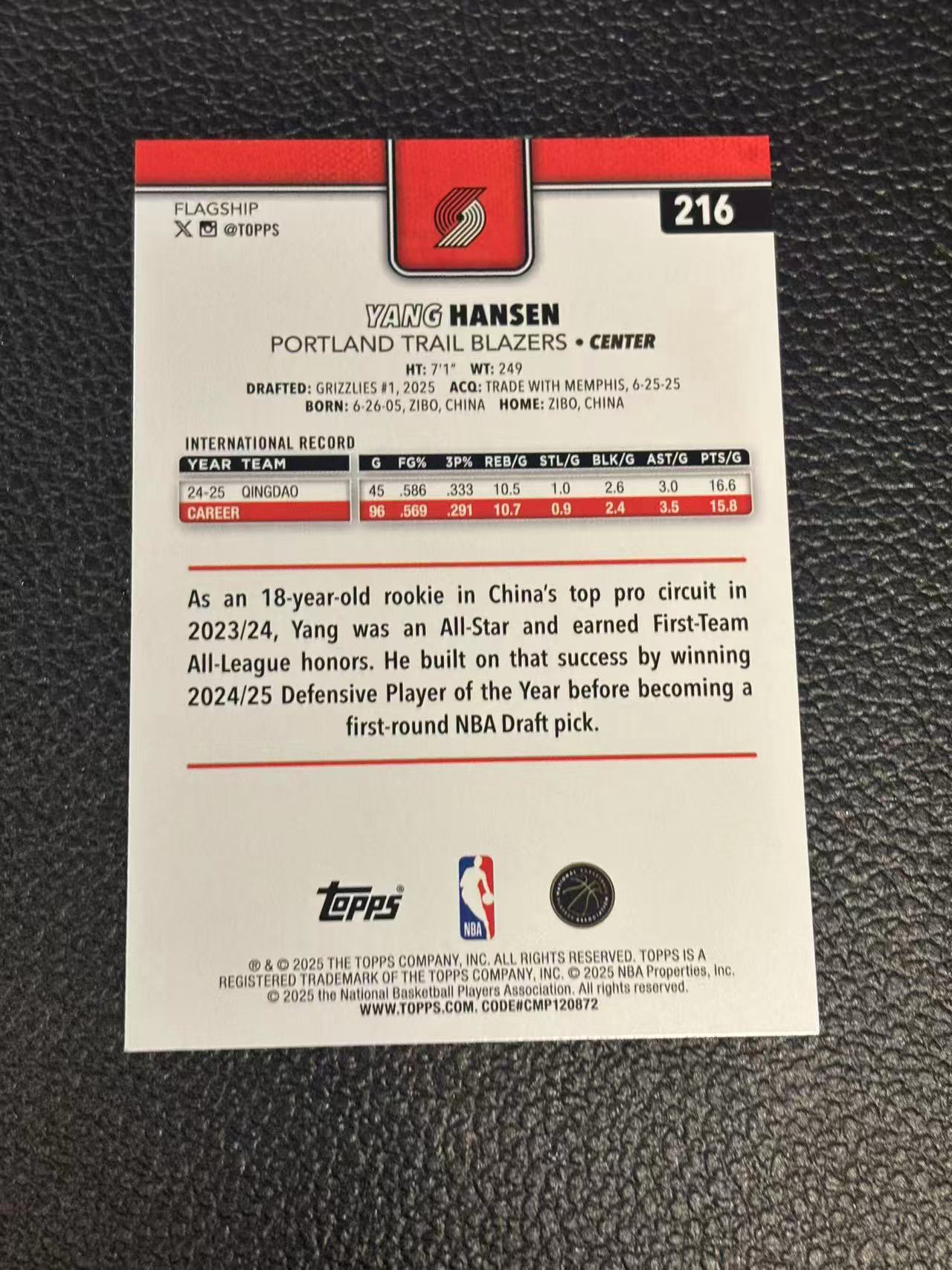 2025 Topps Basketball 杨瀚森 RC 开拓者 新秀 hansen yang 小杨 正base 意义非凡 收藏必备 卡品如图 第四张