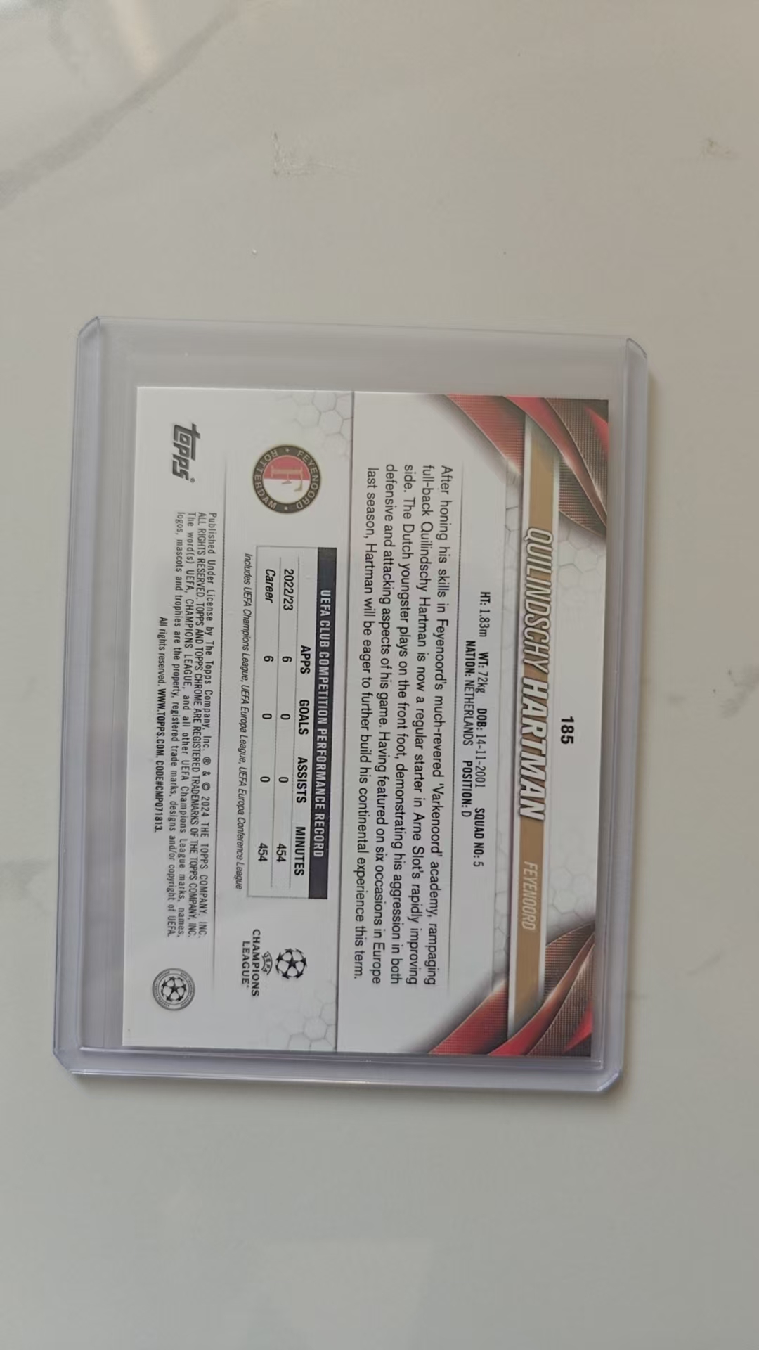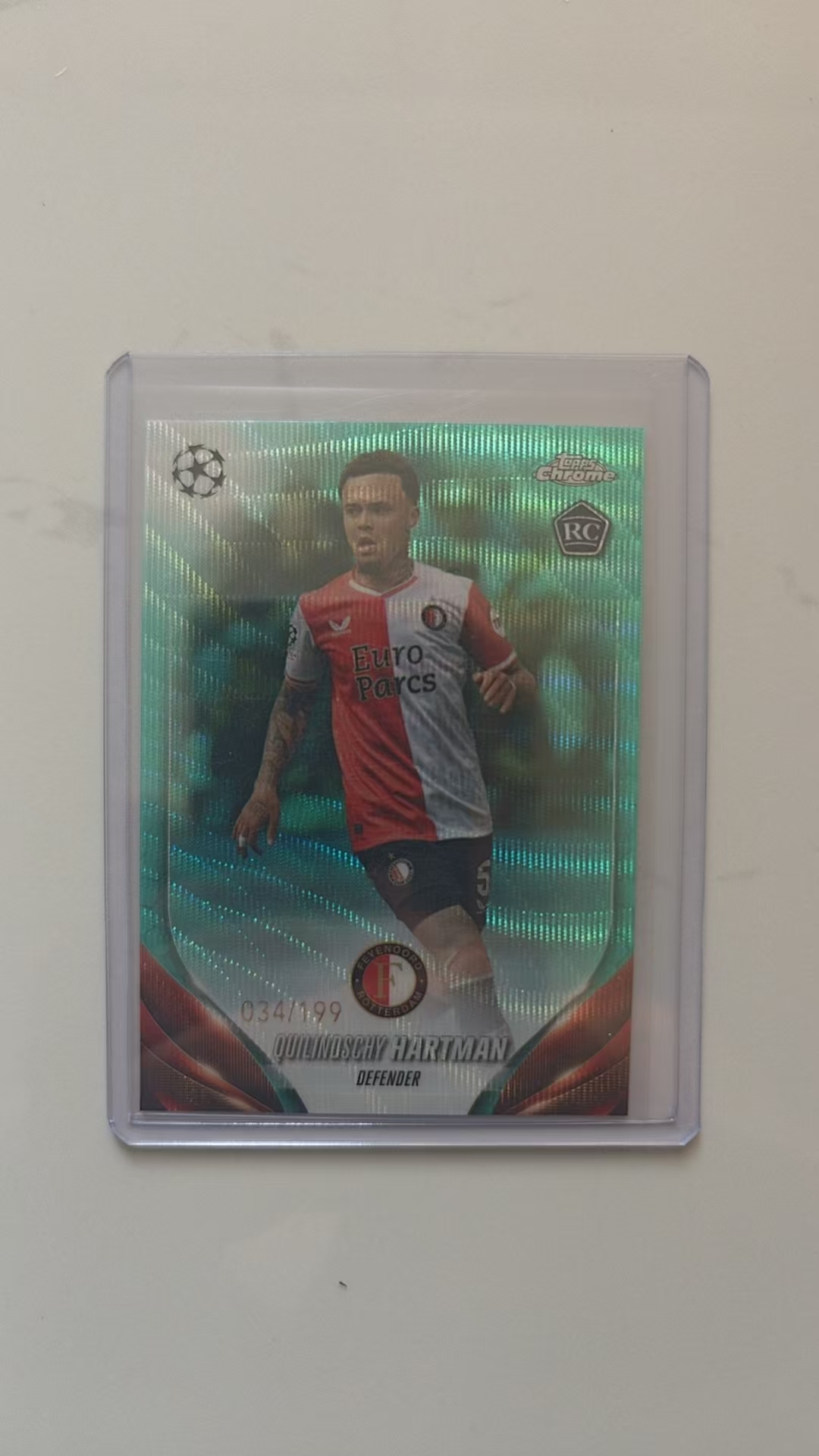 2023-24 Topps Chrome Quilindschy Hartman RC 奎林奇·哈特曼 费耶诺德 荷兰 新秀 034/199 青绿波纹折 欧战TC正系列 伯恩利