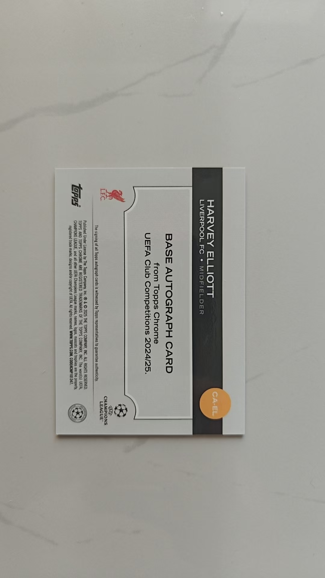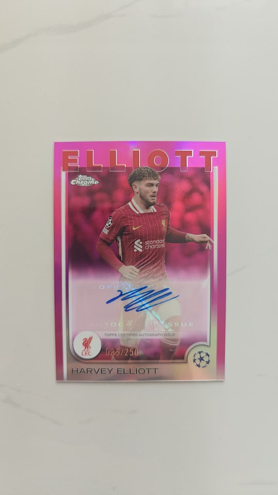 2024-25 Topps Chrome Harvey Elliott 哈维·埃利奥特 利物浦 英格兰 带编签字 085/250 粉折 墨迹完美 欧战TC正系列 返场