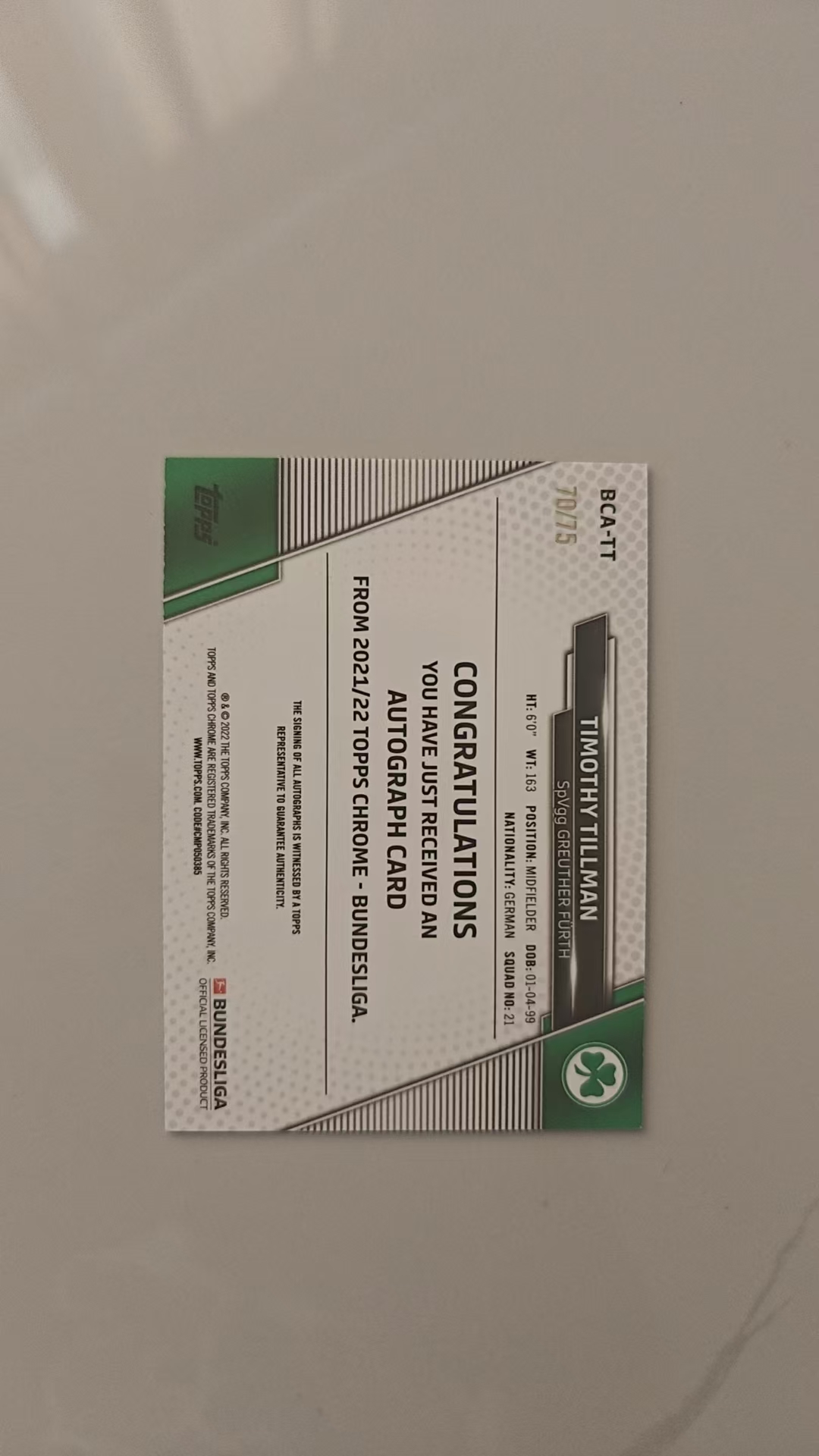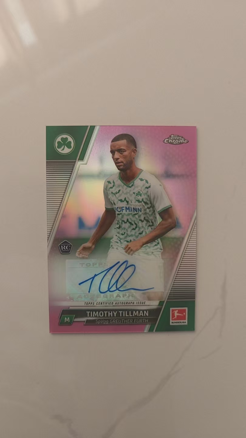 2021-22 Topps Chrome Bundesliga Timothy Tillman RC 蒂莫西·蒂尔曼 菲尔特 德国 新秀 带编签字 70/75 粉折 墨迹完美 德甲TC