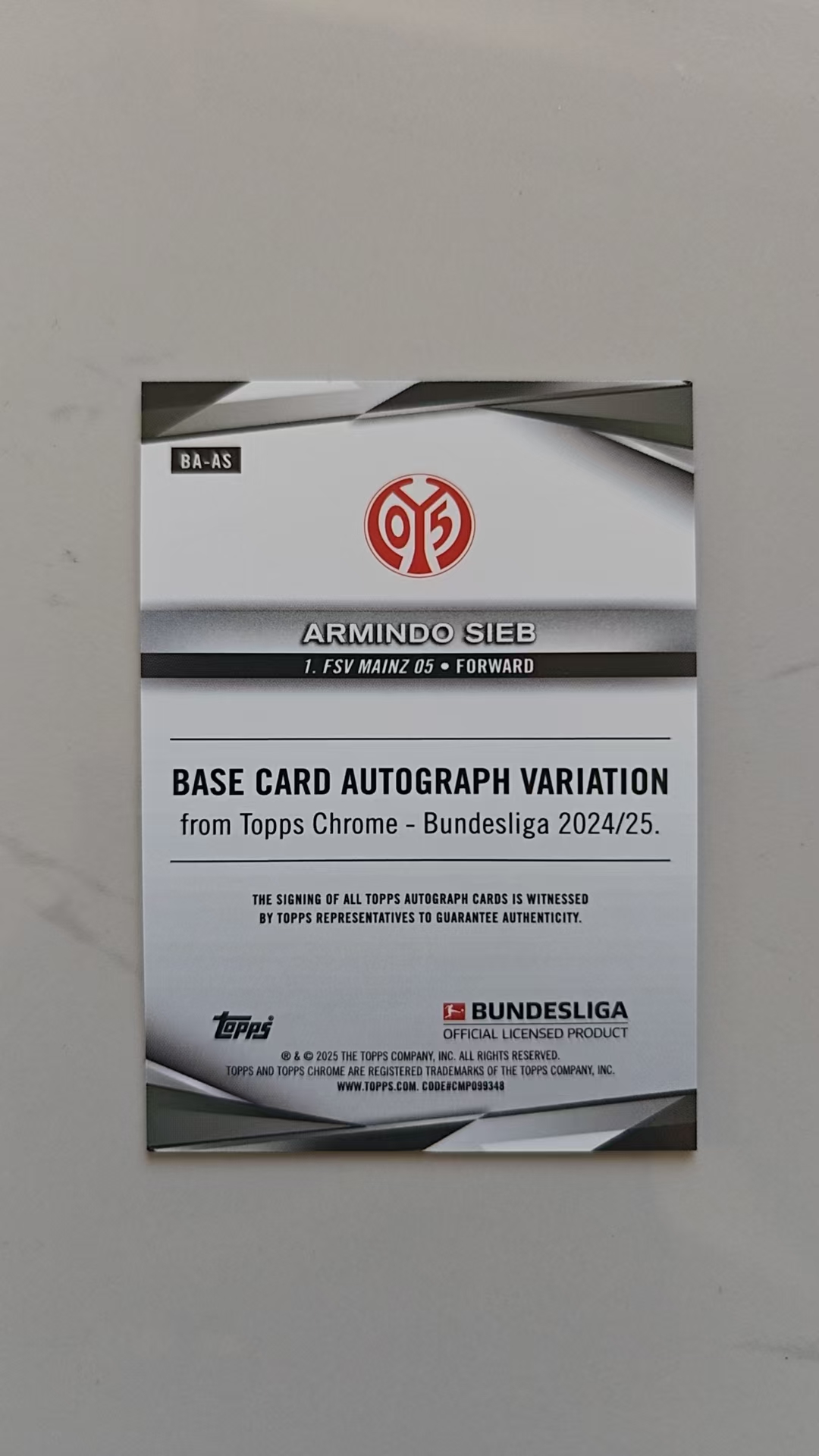 2024-25 Topps Chrome Bundesliga Armindo Sieb 阿明多·西布 美因茨 德国 带编签字 45/52 Topps折 墨迹完美 箱货 大比例 德甲TC 返场