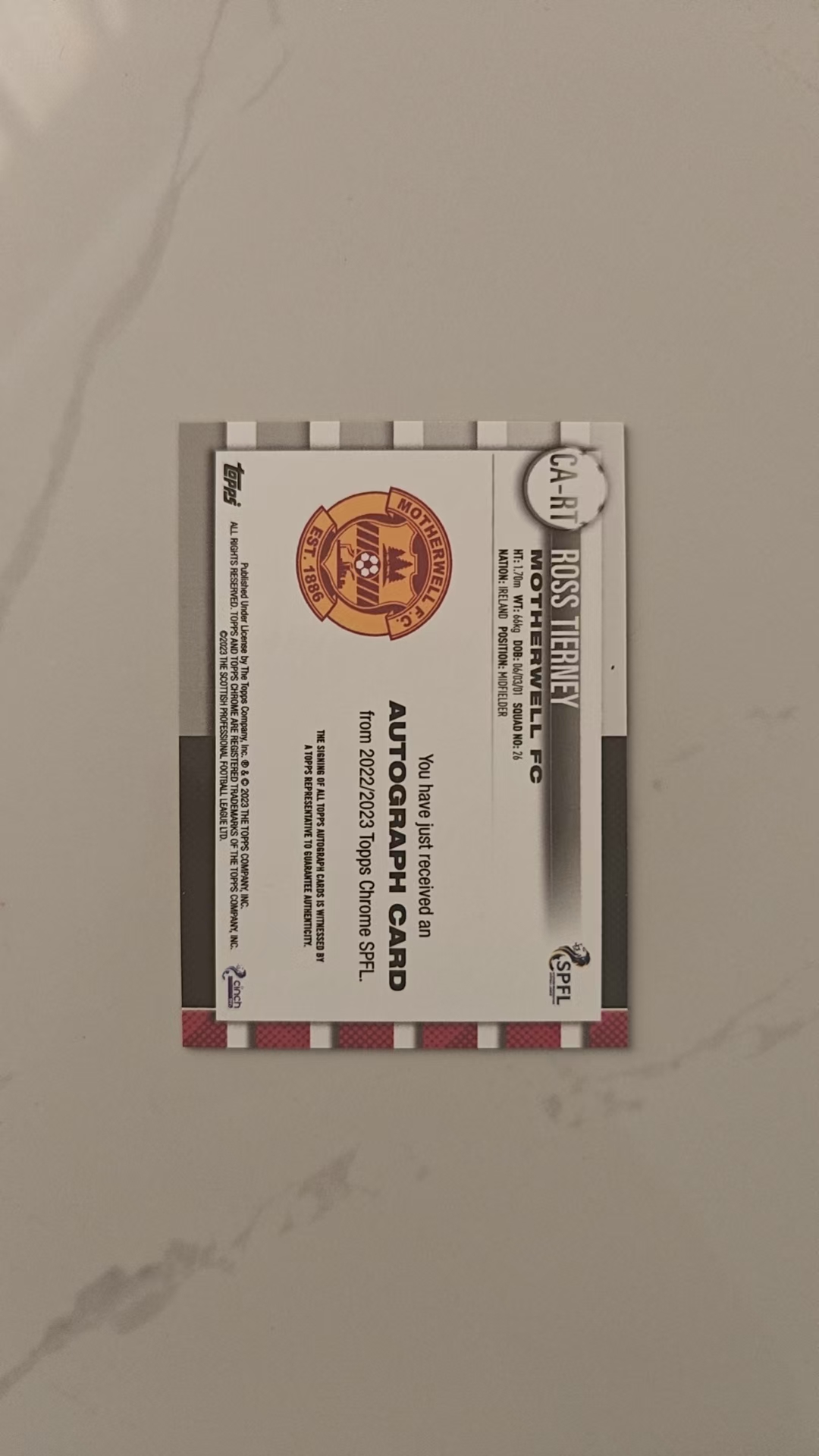 2022-23 Topps Chrome SPFL Ross Tierney 罗斯·蒂尔尼 马瑟威尔 爱尔兰 签字 墨迹完美 苏格兰足球超级联赛TC 苏超TC 波希米亚人队