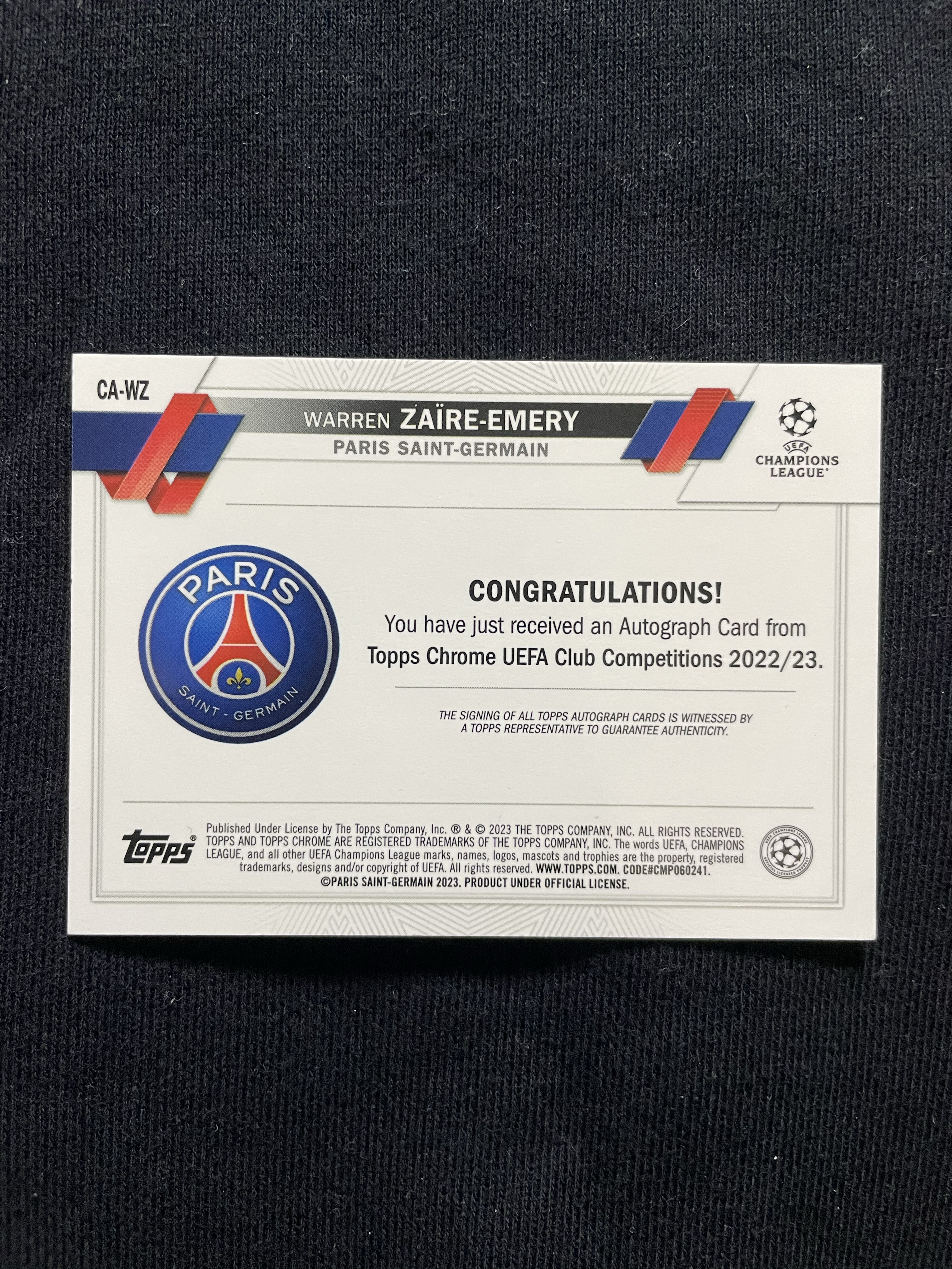 2023 Topps Chrome Warren Zaïre-Emery RC 【苦茶子拍卖】扎伊尔 埃梅里 新秀 欧冠TC 签字 签名 银折签 巴黎圣日耳曼 卡品如图