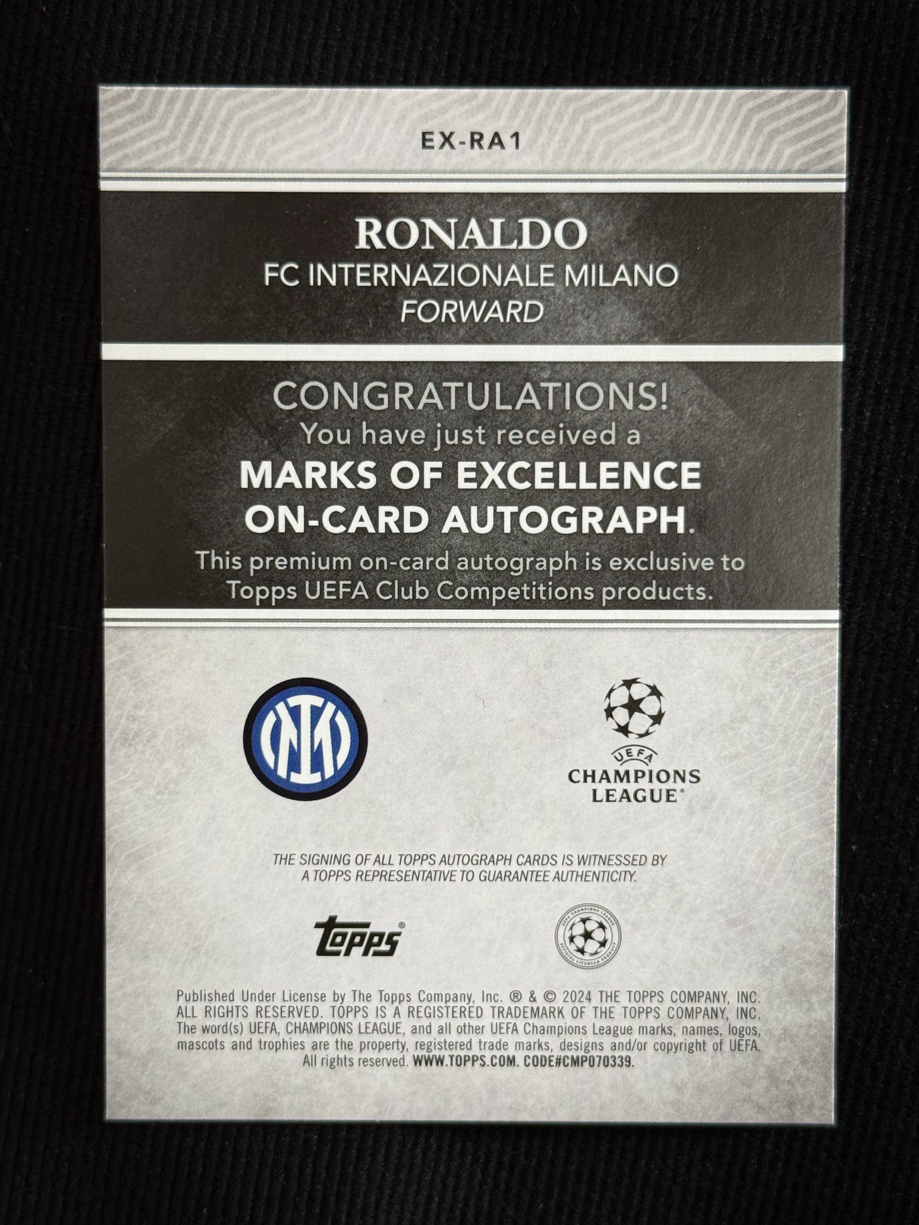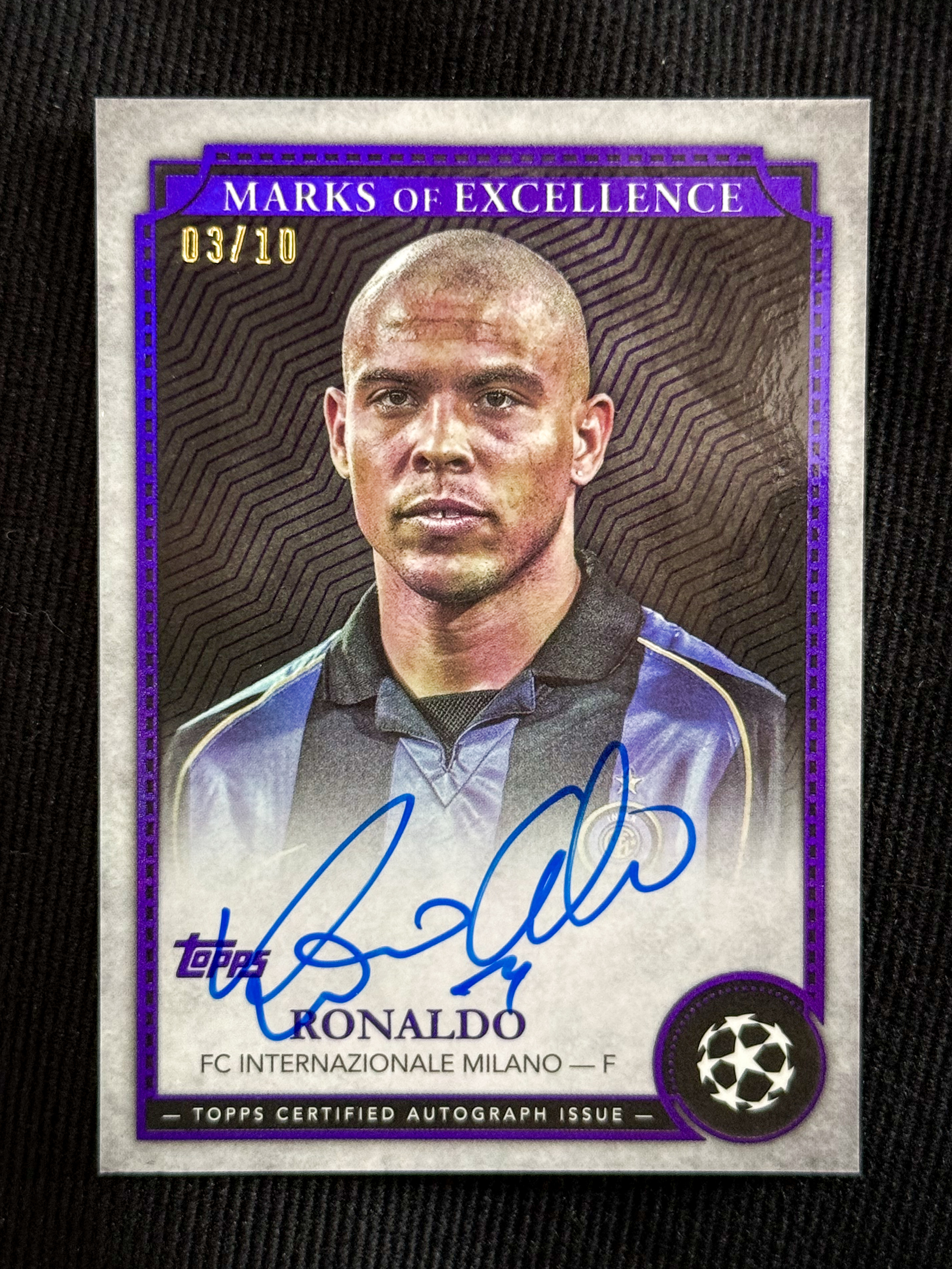 2024 Topps Finest Ronaldo 欧冠 国际米兰 大罗 罗纳尔多 完美签字 卡签 插入签 卓越标志 大比例 SSP 蓝紫折 03/10编 超低编 墨迹湛蓝 收藏必备
