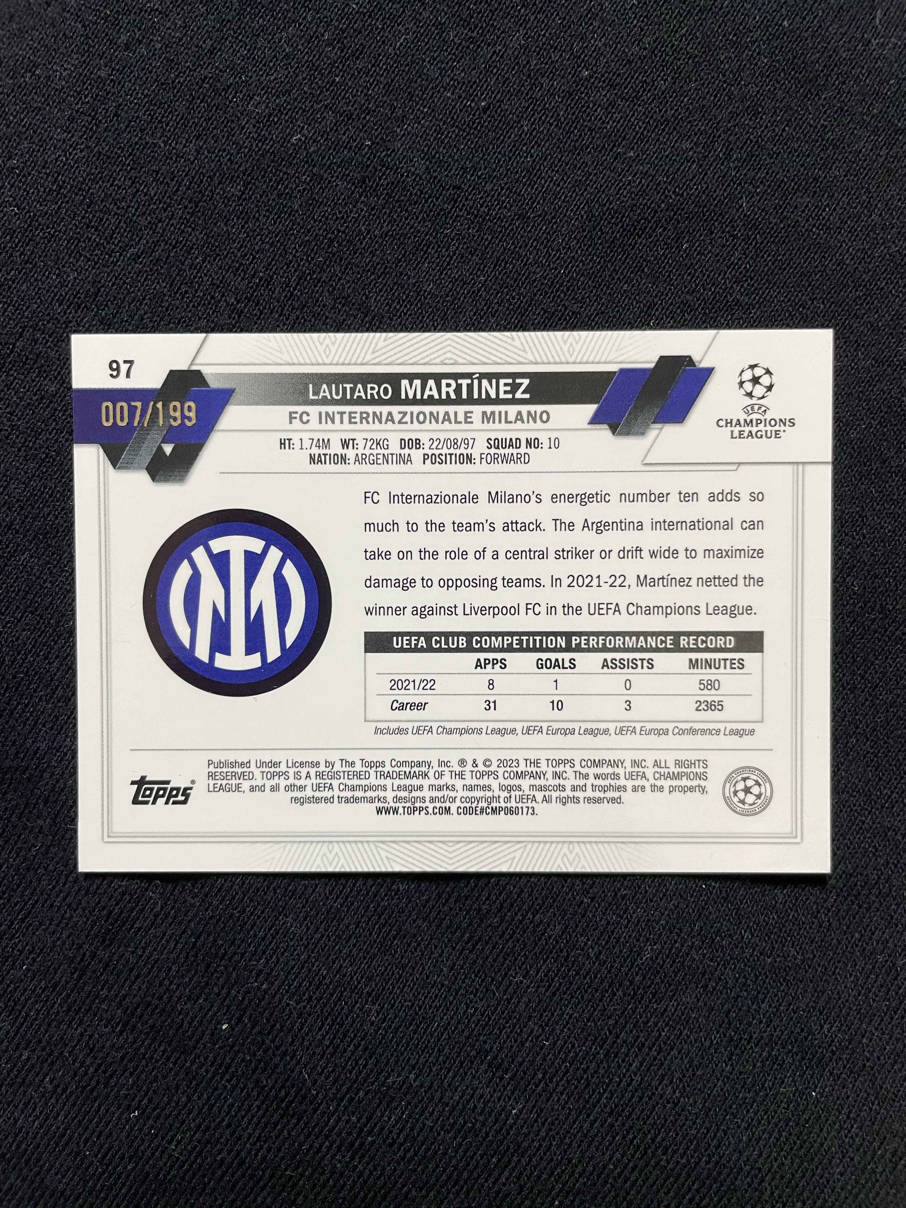2023 Topps Chrome Lautaro Martínez 【苦茶子拍卖】劳塔罗 马丁内斯 欧冠TC 199编 青折 折射 国际米兰 阿根廷 卡品如图