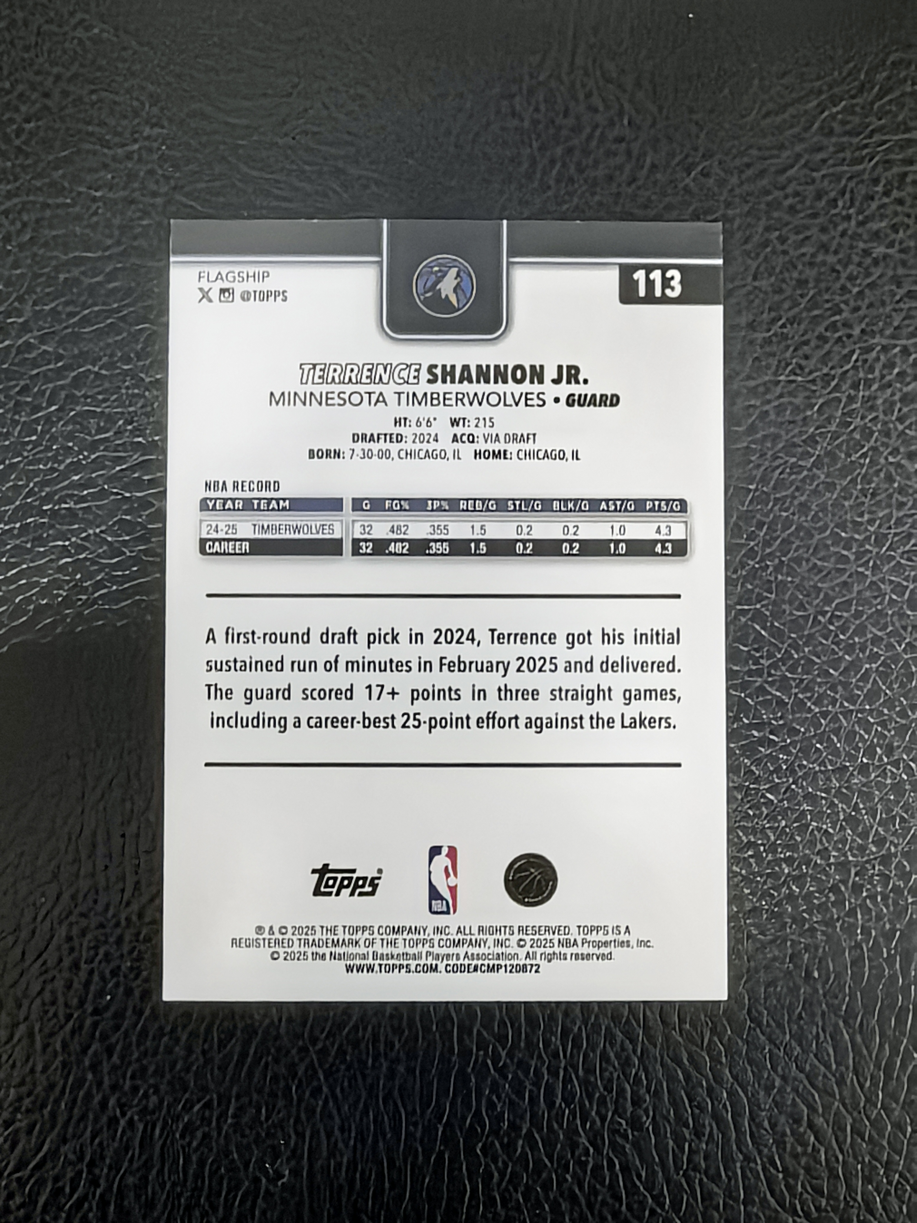2025-26 Topps Jumbo Terrence Shannon Jr. 元年 折射 比例 特卡 小特伦斯 香浓 1688/2025编 森林狼队 收藏必备 卡品如图