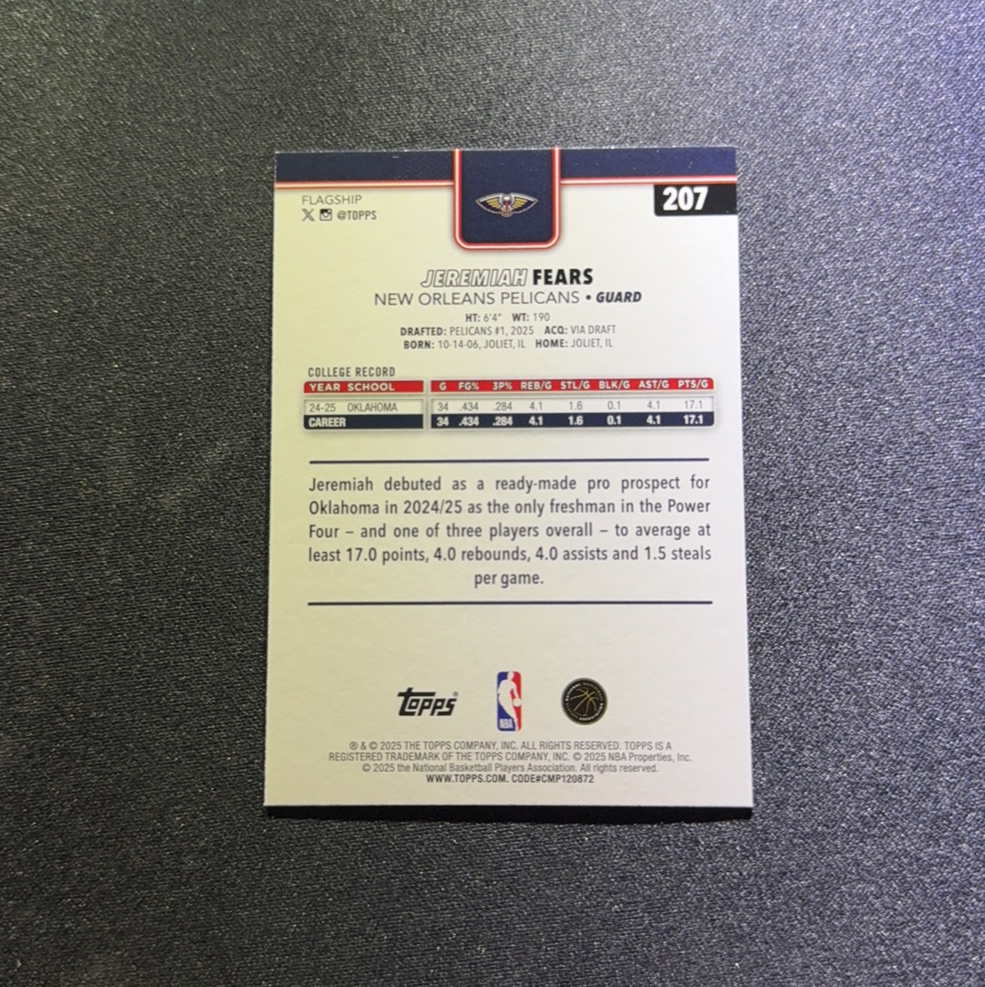 2025-26 Topps Flagship Jeremiah Fears RC 杰里迈亚 费尔斯 鹈鹕 第七顺位 新秀 银折 旗舰 Base 锡安普尔队友 卡品如图 澳门熊
