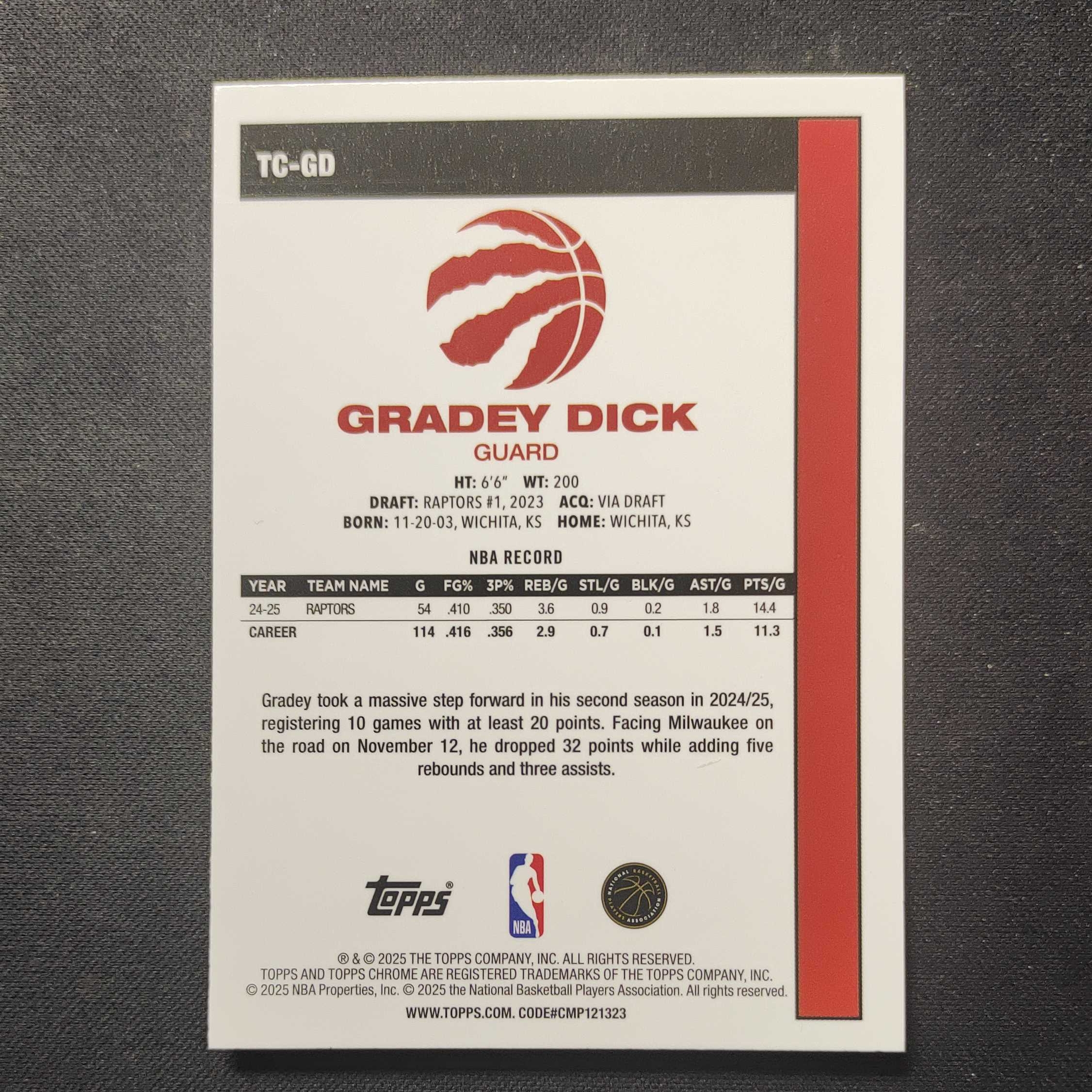 2025-26 Topps Basketball Gradey Dick 【太阳球星卡社】TC 猛龙 格雷迪 迪克 mojo折 Chrome 银折 卡品如图(泡泡龙)