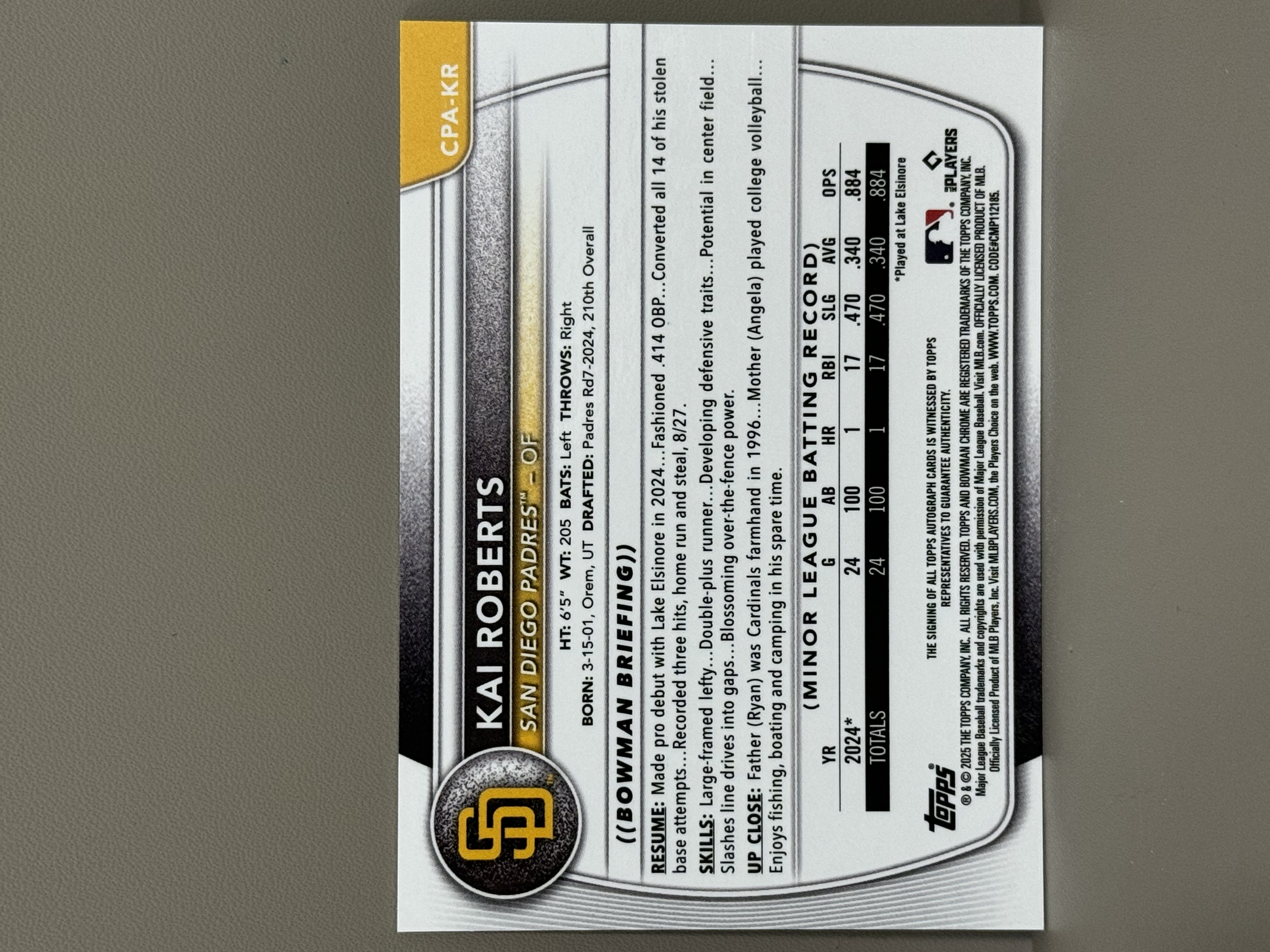 2025 Topps Bowman Chrome 棒球 Kai Roberts 凯 罗伯茨 1st RC 新秀 卡签 圣地亚戈教士 卡品如图 收藏投资必备