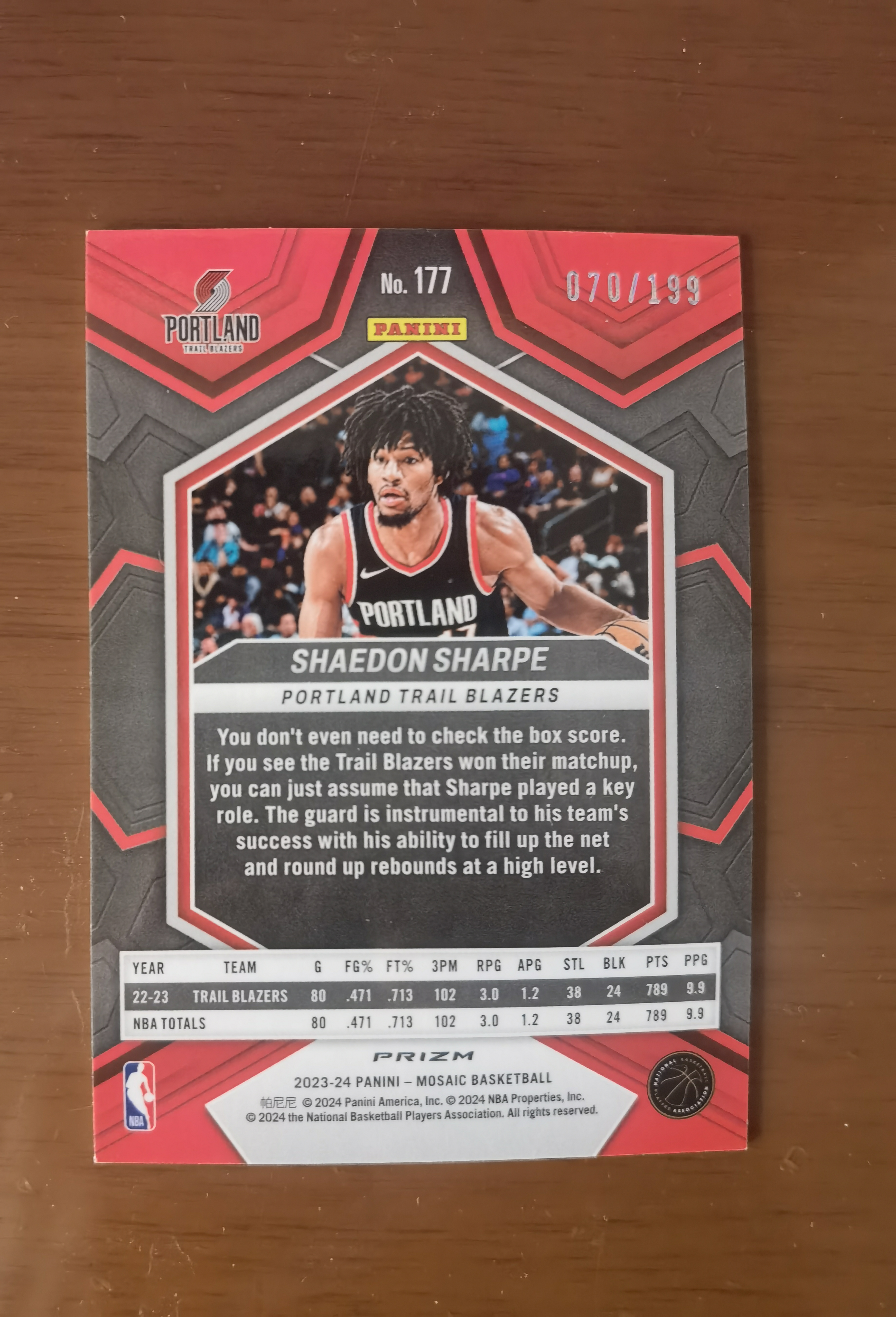 2023-24 Panini Mosaic Shaedon Sharpe 马赛克 开拓者 谢登 夏普 编 蓝马赛克 折射 199编 专收必备