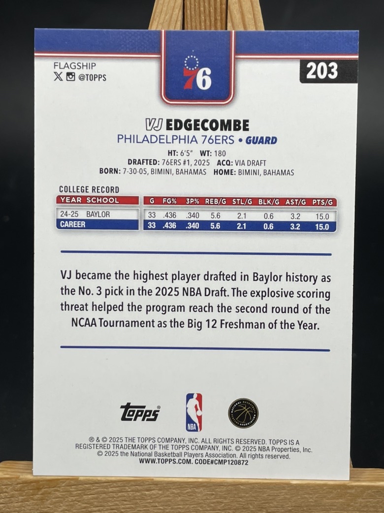 2025 Topps Flagship Valdez VJ Edgecombe Jr RC 【小哈拍卖-枫29】VJ埃奇库姆 新秀 第一版 正base 状态火热 大热潜力新星 投资收藏 7