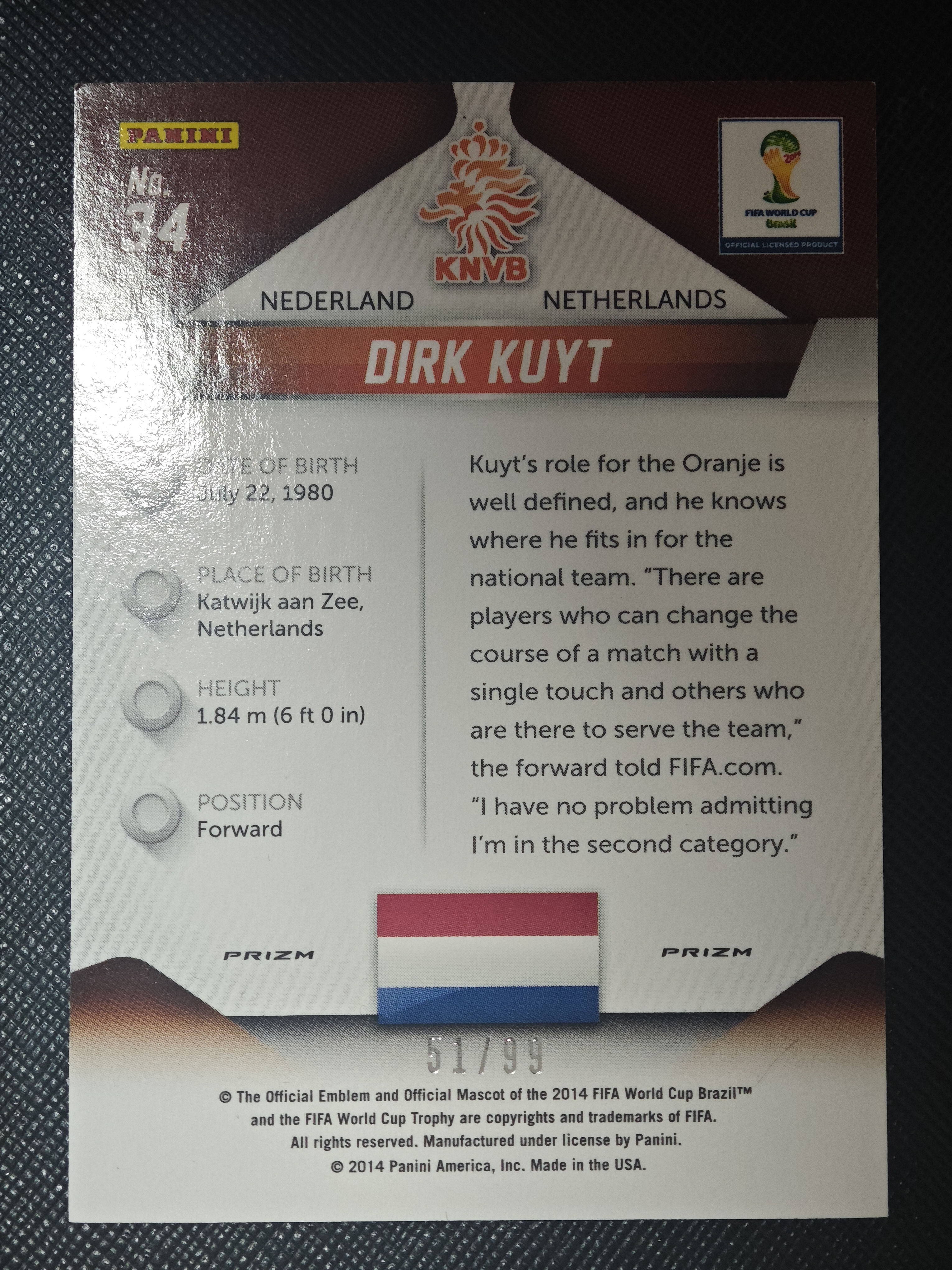 2014 Panini World Cup Prizm kuyt 库伊特 元年 99编 荷兰 Netherlands 利物浦 Liverpool 正Base 设计经典 老卡稀有!