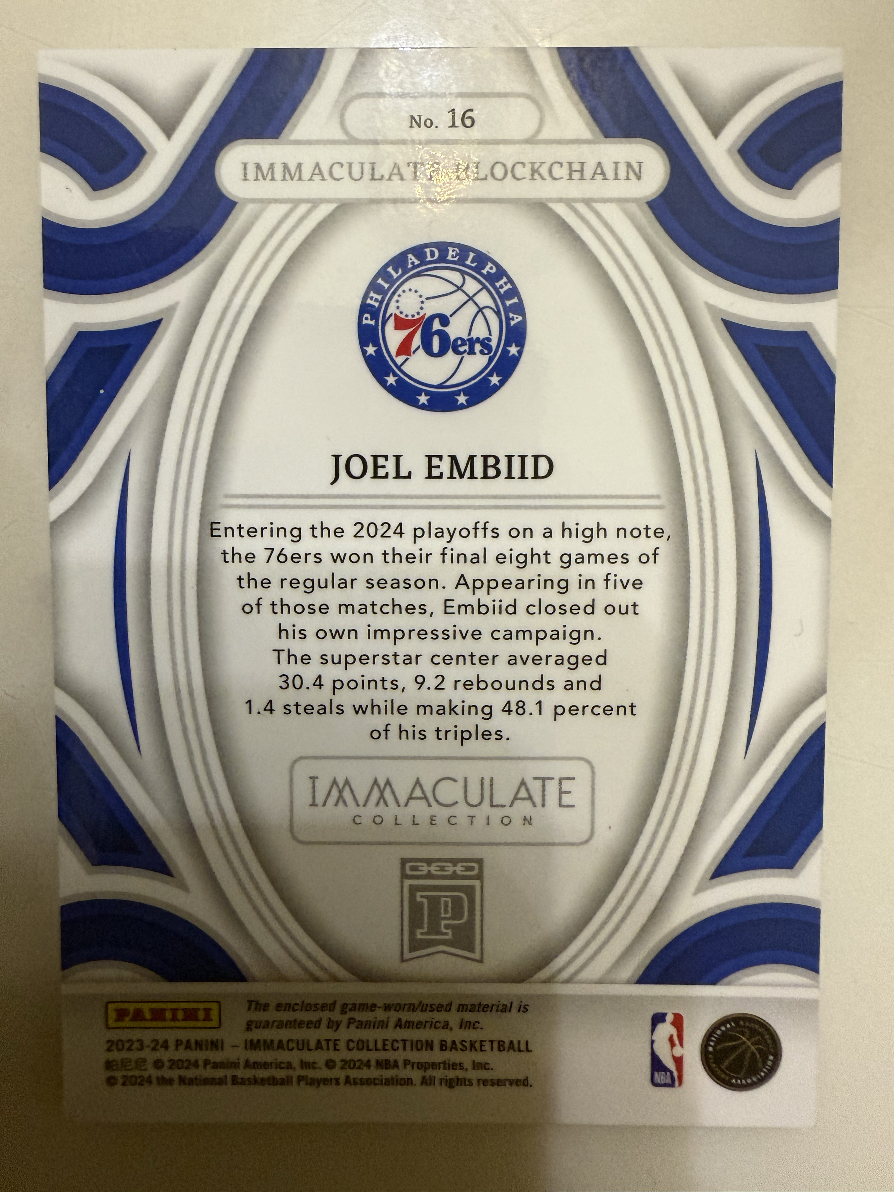2023-24 Panini Immaculate Joel Embiid 25编 低编 爱咪咪 恩比德 大帝 76人 球衣 亲穿 落场 稀有 暴力切割 卡品如图