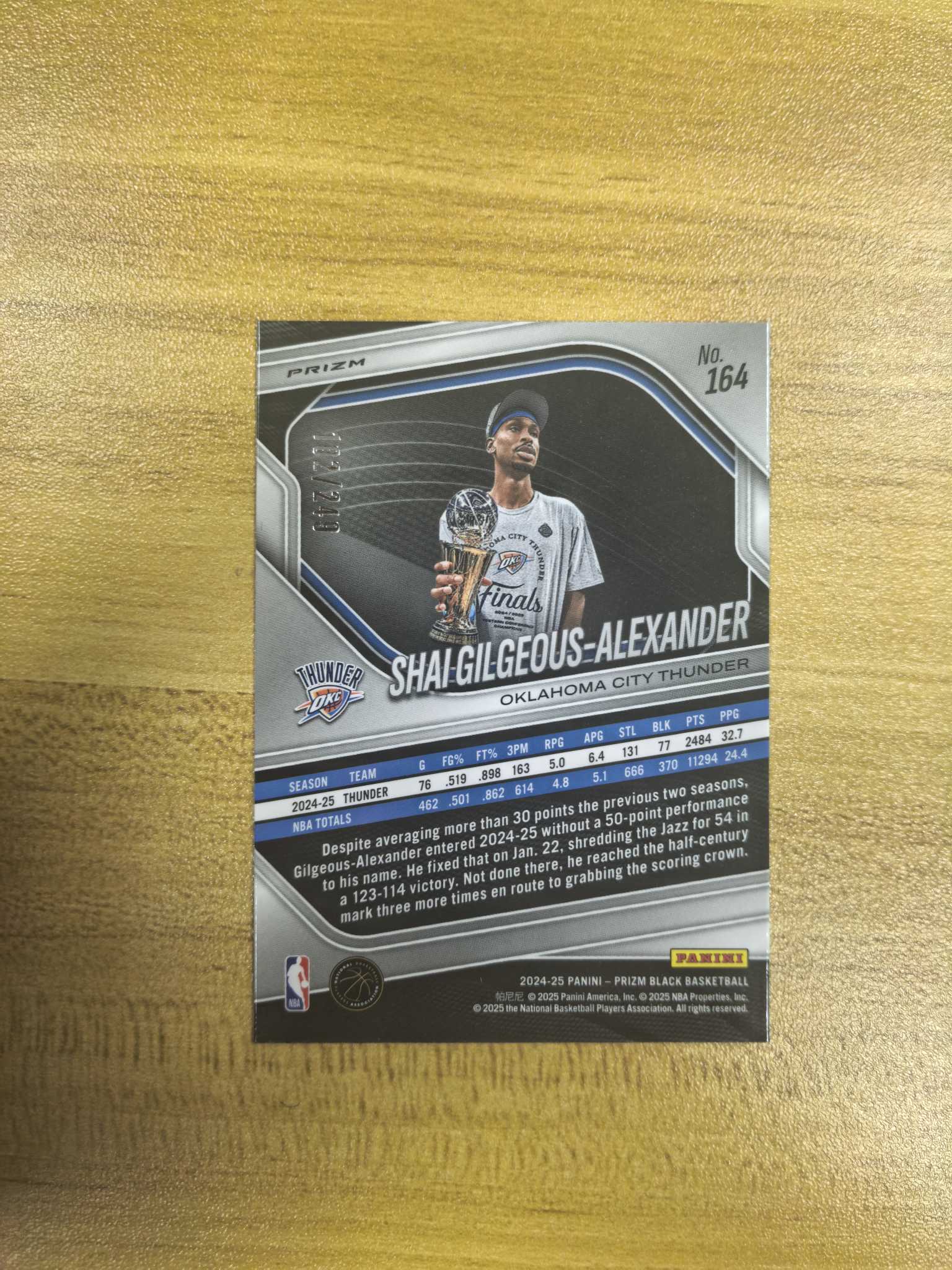2024-25 Panini Prizm Shai Gilgeous-Alexander pz black 绝唱 亚历山大 雷霆 sga 总冠军 捧杯 超级选图 102/249编 收藏必备 cz123