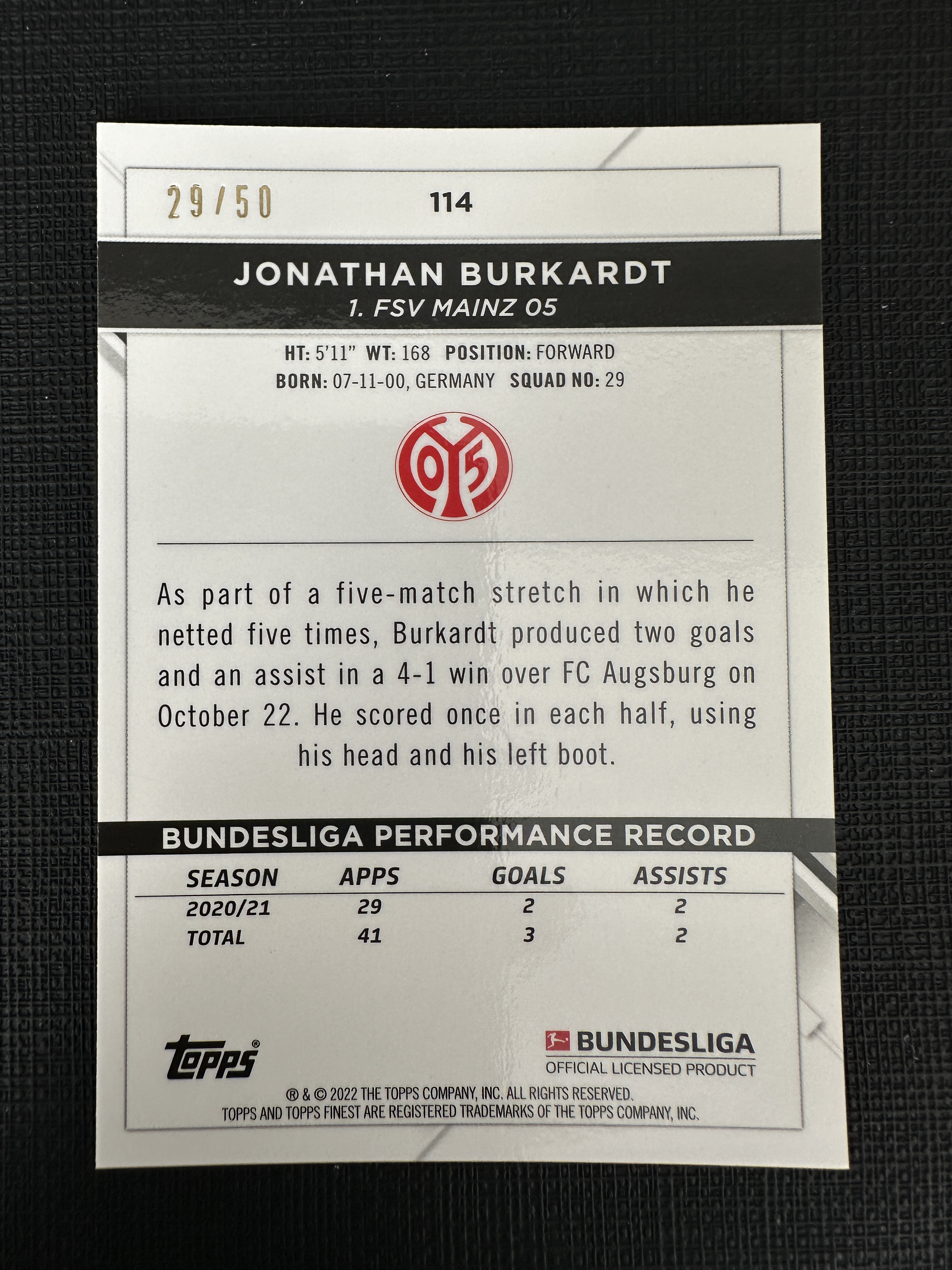 2022 Topps Topps Finest Jonathan Burkardt 德甲 美因茨 伯卡特 布尔卡特 金折 50编 【默认微瑕一日一快递 不累计 不发到付】卡卡z