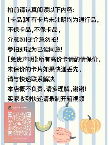 🎃【卡品】所有卡片未注明均为通行品,不保卡品,不保卡品,介意勿拍!介意勿拍!请仔细看图一般薄卡的小划痕,厚卡的小白边小白角,老卡有白边白角,镜面卡签有小划痕,都属于通行品相。评级卡砖上的划痕和破损不属于品相问题,品相要求高者请购买评级卡。