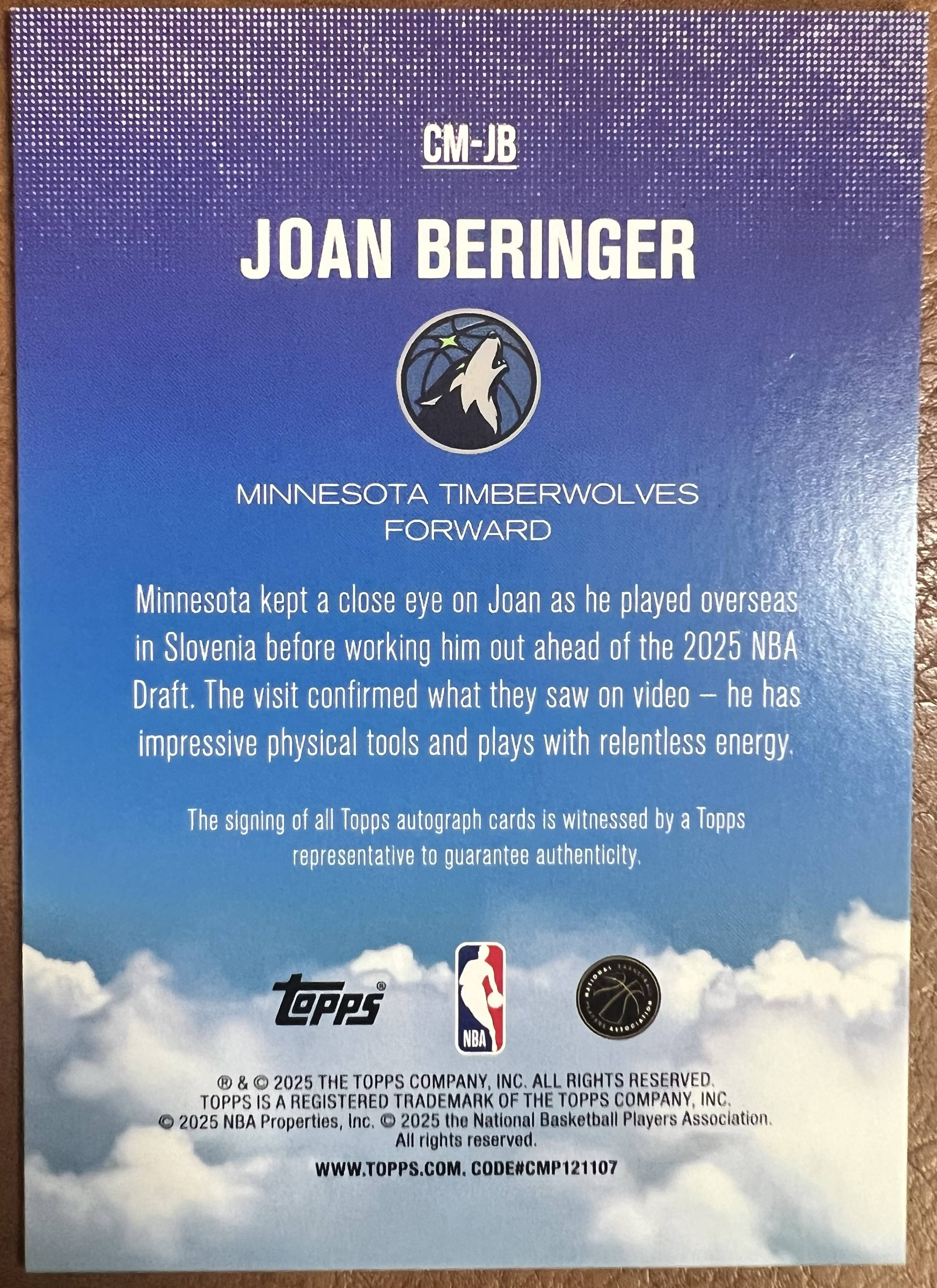 2024-25 Topps NBA Hoops Joan Beringer RC /泰欧气卡社 /Topps NBA 森林狼 新秀RC 若昂 贝兰热 签字 字迹完美 卡品如图
