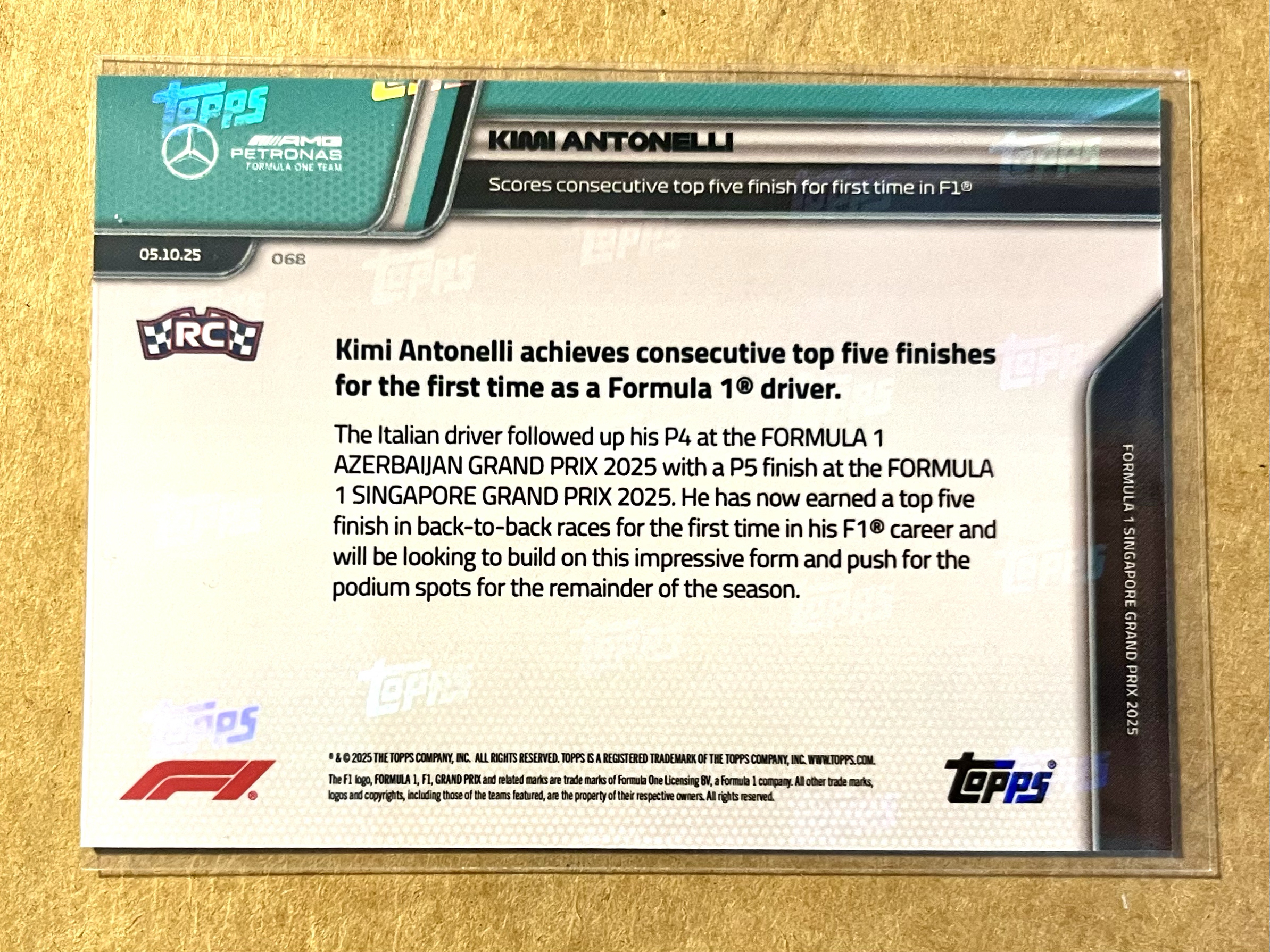2025 Topps 【蓝矿】 Kimi Antonelli 基米·安东内利 Topps now系列 F1 75周年 世界一级方程式锦标赛 新加坡站 RC新秀标 稳步向前!连续五次比赛中达到前五成绩!