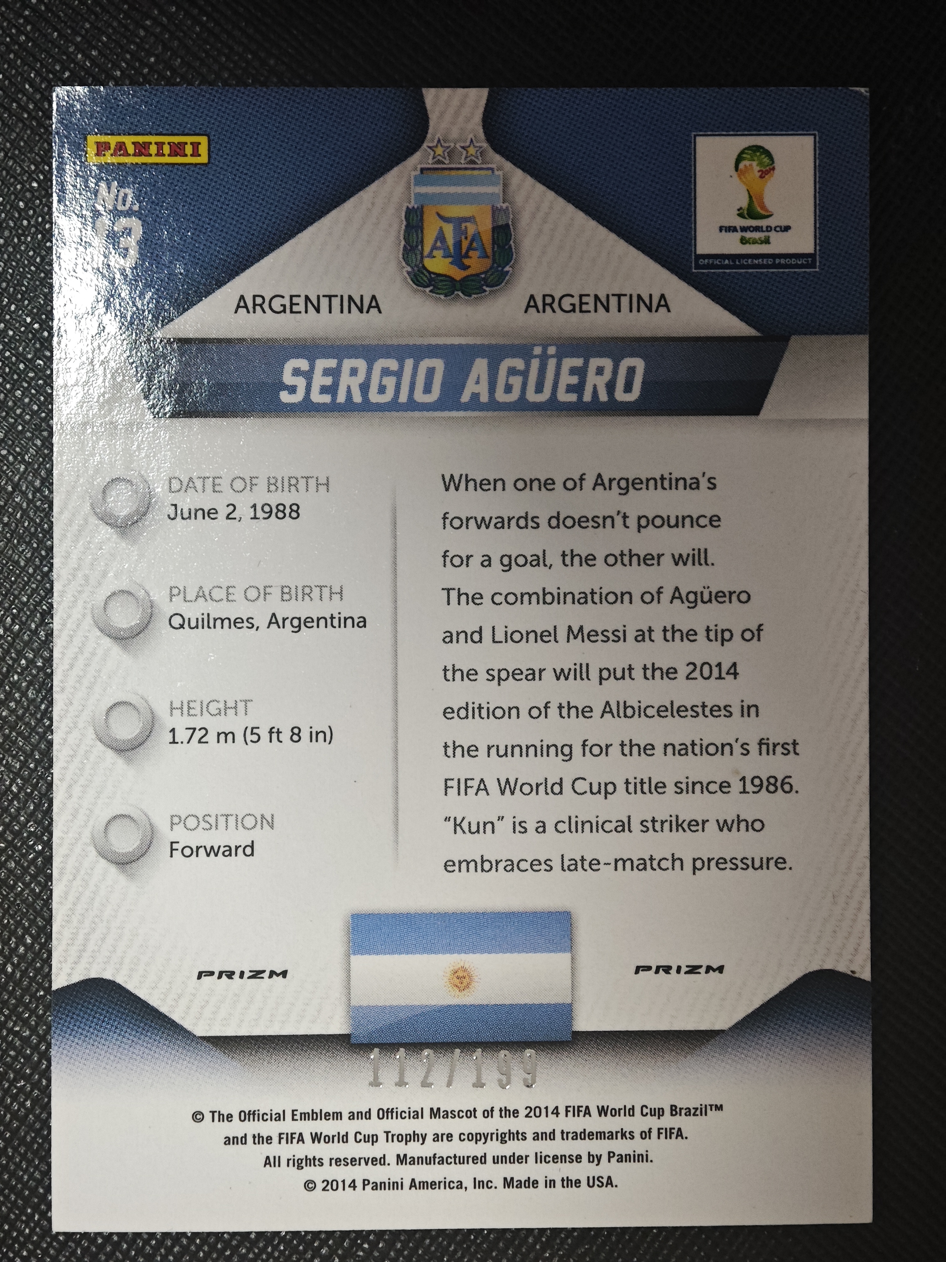 2014 Panini World Cup Prizm 阿奎罗 Sergio Aguero 元年 199编 阿根廷 马竞 曼城 Messi 迪马利亚好友 射手王 正Base 蓝配蓝 设计经典 老卡稀有