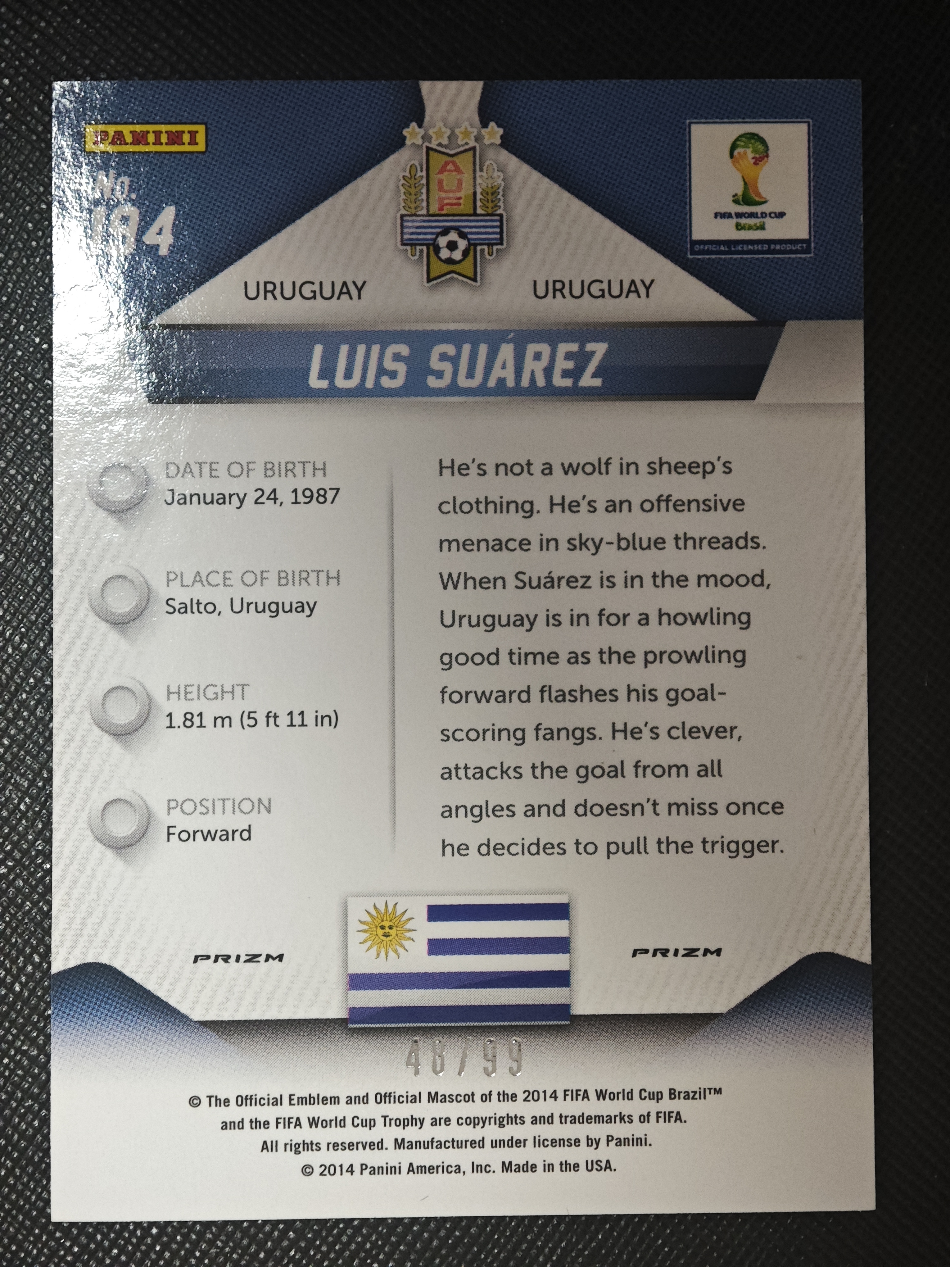 2014 Panini World Cup Prizm 苏亚雷斯 Luis Suarez 元年 99编 乌拉圭 巴萨 利物浦 Liverpool 梅西 Neymar MSN 正Base 低编老卡稀有!