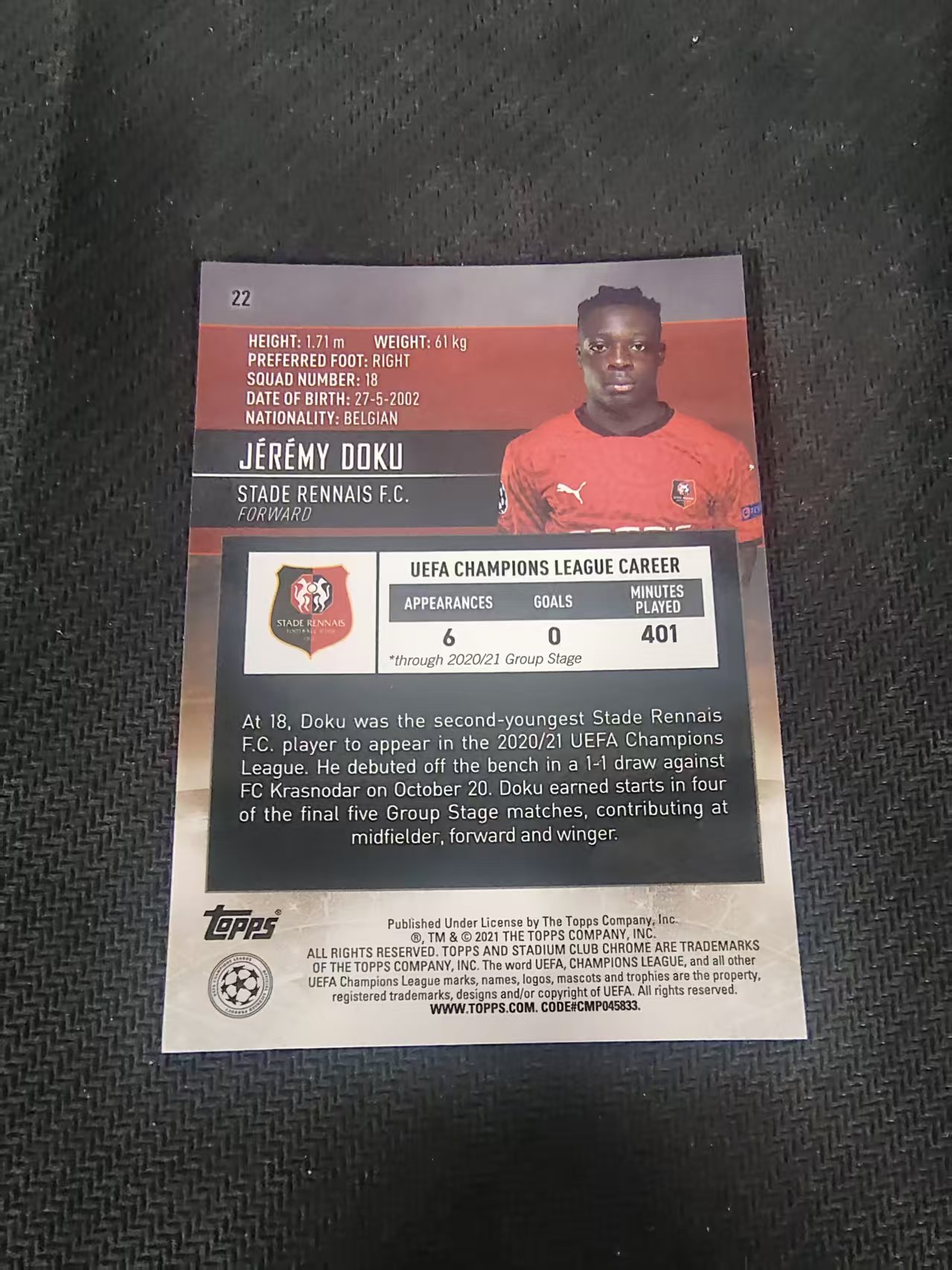 【可合并,不累计】2021 Topps Stadium Club Chrome Jeremy Doku 雷恩 热雷米 多库 新秀 RC 竞技场 欧冠 划痕 边角瑕疵 #22