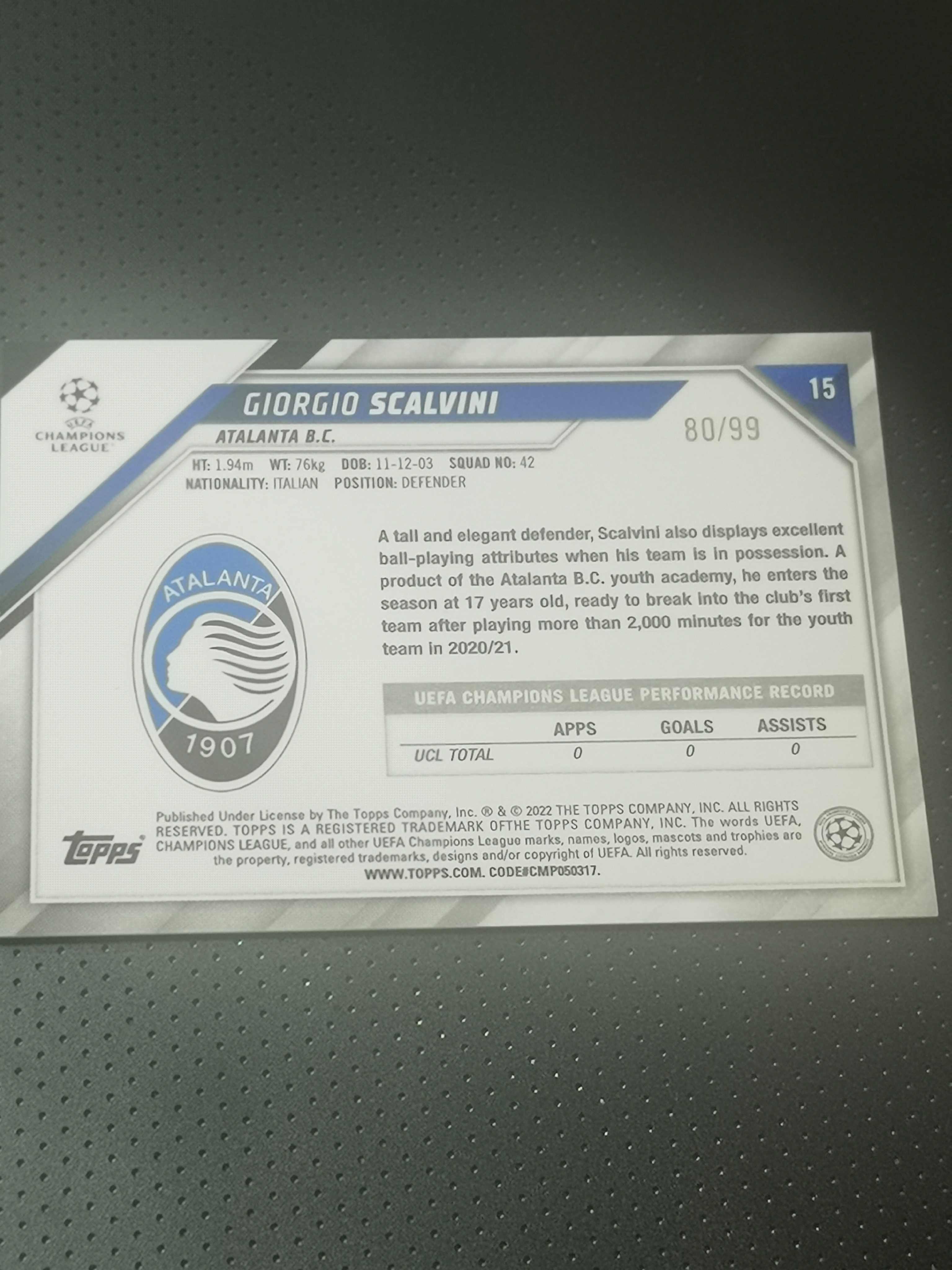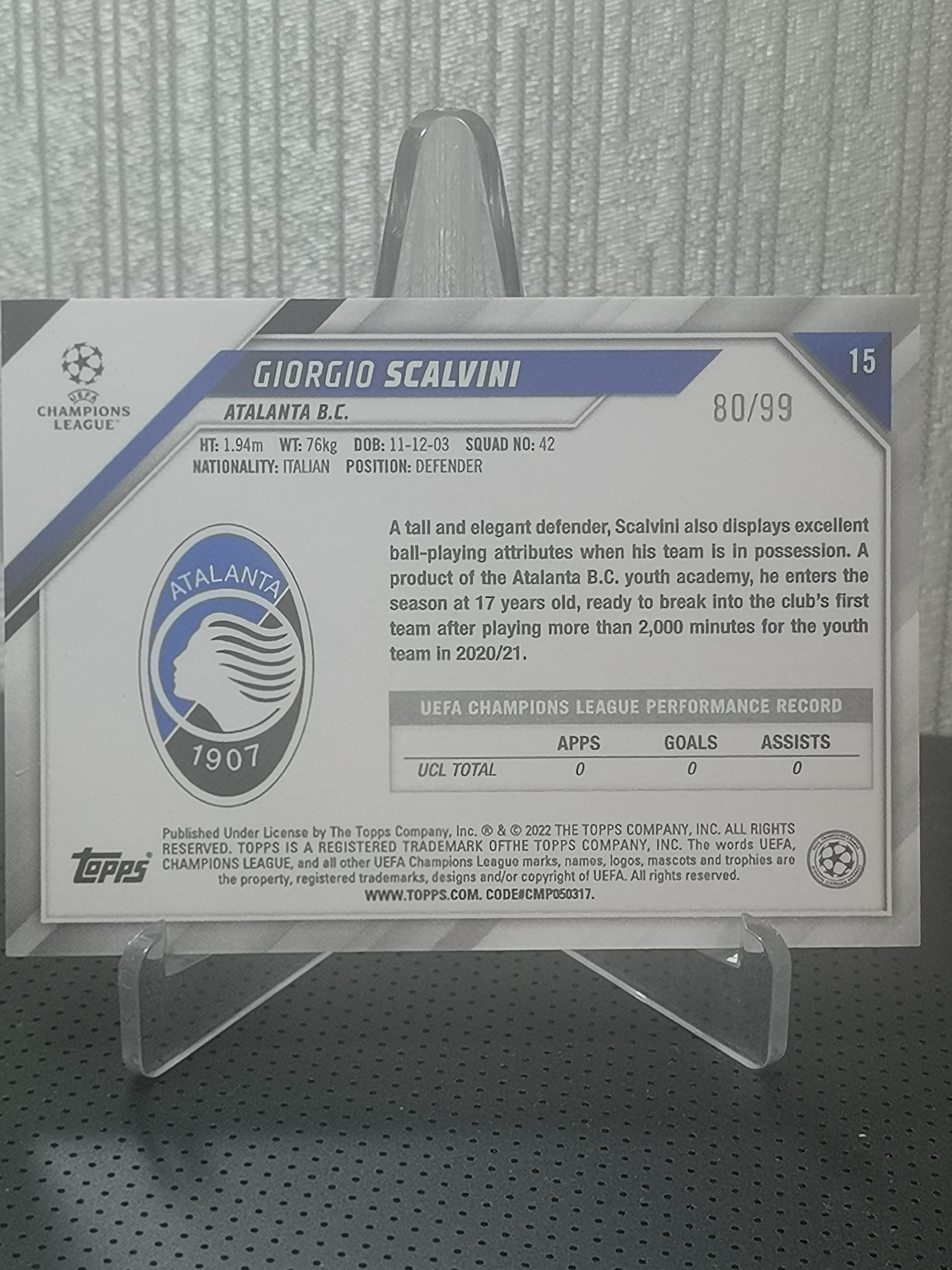 2022 Topps Chrome Giorgio Scalvini 欧冠 蓝宝石 亚特兰大 斯卡尔维尼 80/99编 黄碎冰折 意大利🇮🇹 ITALY RC