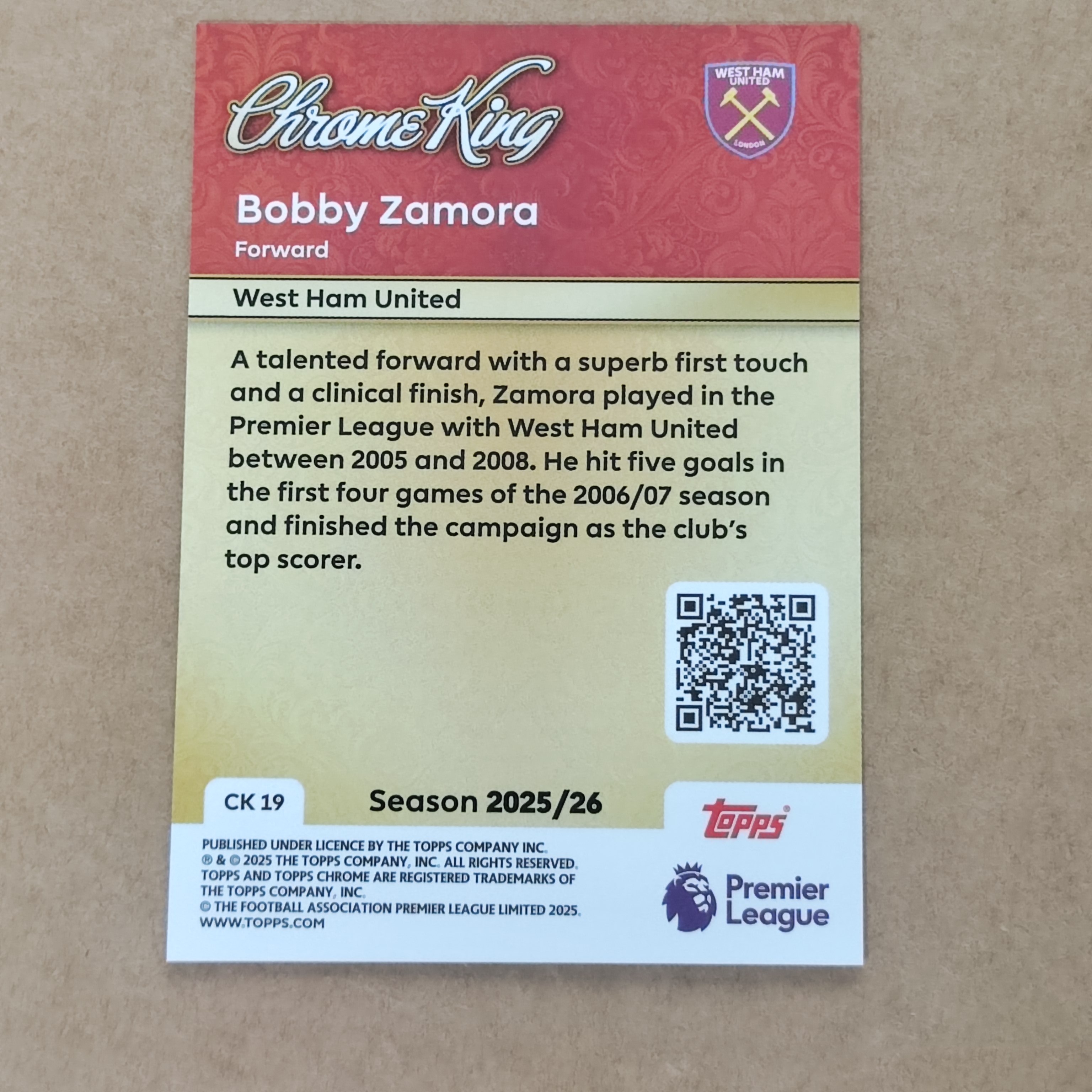 【HADE拍卖-免费上拍】2025-26 Topps Premier 英超 Bobby Zamora 博比·扎莫拉 西汉姆联 英超 chrome之王特卡 HD0012-archer