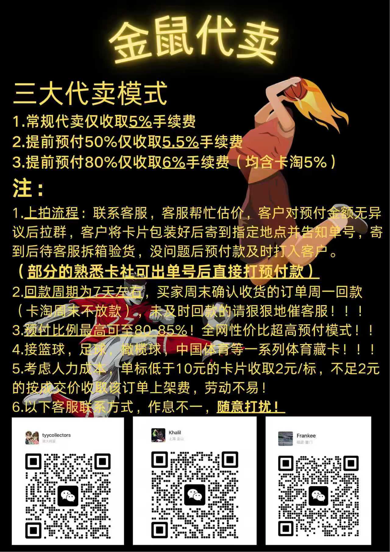 1:金鼠拍卖 模式一:正常上拍,只收取卡淘5%,卡淘回款后立即结算,预计7天 模式二:提前预付50%,卡片寄到后确认无误即可打款,收取5.5%(含卡淘费率),买家确认收货后立即结算回款 模式三:提前预付80%,卡片寄到后确认无误即可打款,收取6%(含卡淘费率)买家确认收货后立即结算回款,模式四:截标预付70%,剩余尾款买家确认收货后结算,收取5.5%(含卡淘费率)。 注:卡淘回款周期一般为截标后卖家付款确认到货后为准;有需要代卖联系客服微信:Timeless811Khalil;2:卡品如展示图所示,默认通行品相(厚卡异形卡老卡白边白角,折射卡印刷线等均属常见情况),有明显瑕疵会在图片中拍出,卖家出价前请务必看清,不接受中标后没看到其他图片中拍出瑕疵的借口,完美主义者请拍已评级的卡,如卡品有瑕疵且超出通行品范畴未拍出,请开箱时录视频为证并非买家自己失误导致,评级卡不再讨论卡品问题,lot的卡片不保卡品卡具,单卡低于10元不保卡具,单卡高于10元或带编卡片保卡膜和夹; 3:拍品不累积,不累积,不累积!!!如需合并订单请后台私信,合并后请于截标后3天内付款,之后会按照默认地址发出; 4:除部分偏远地区到付外,其余地区快递均统一价顺丰空运特快寄付不到付,特殊情况需到付的,收取1元打包材料空运到付发出,若不接受请勿拍请勿拍请勿拍 5:卡友们有任何问题请私信留言,欢迎关注;玩卡开心第一位,愿大家都可收到自己喜欢的卡。