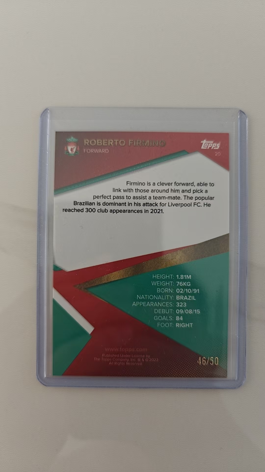 2021-22 Topps Liverpool Team Set Robrto Firmino 罗伯托·菲尔米诺 巴西 46/50 金折 利物浦队盒 吉达国民 返场