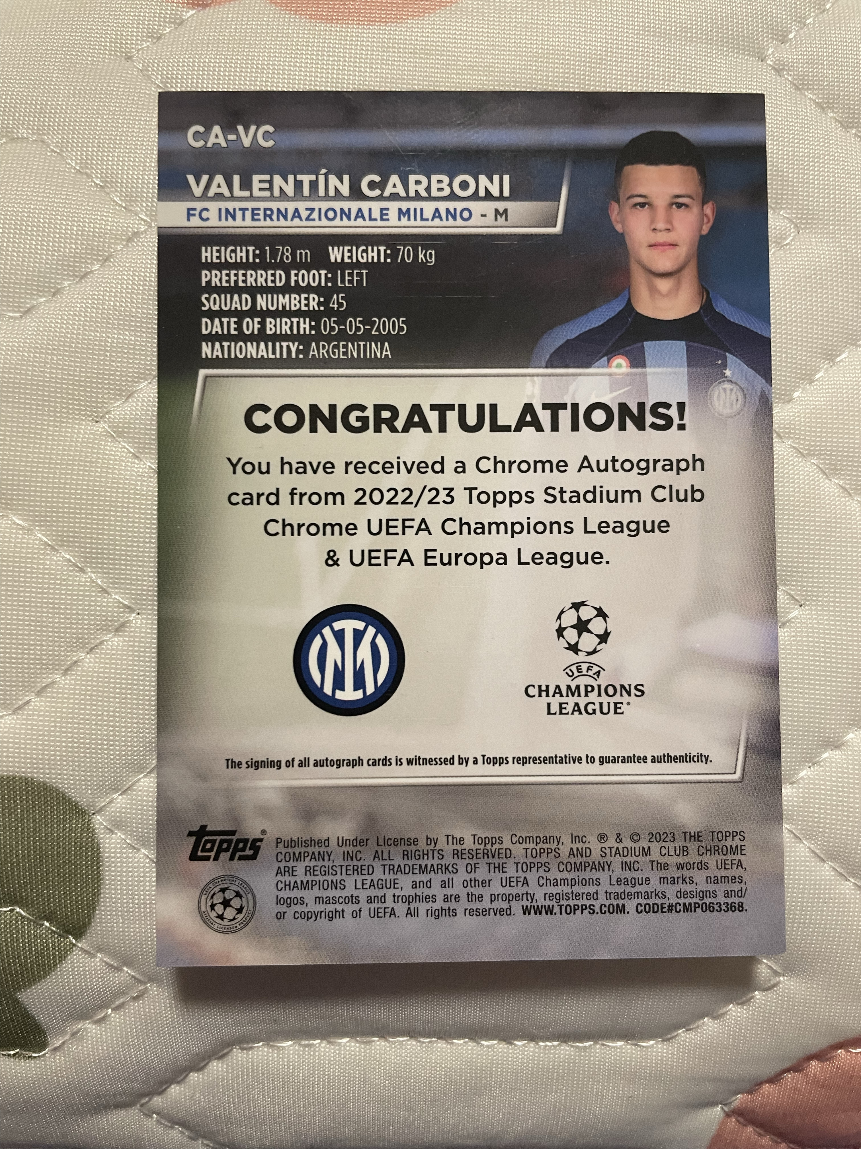 2022-23 Topps 竞技场 Valentín Carboni RC 瓦伦丁·卡尔博尼 新秀 RC 签字 折射 国际米兰 阿根廷 足球 国米