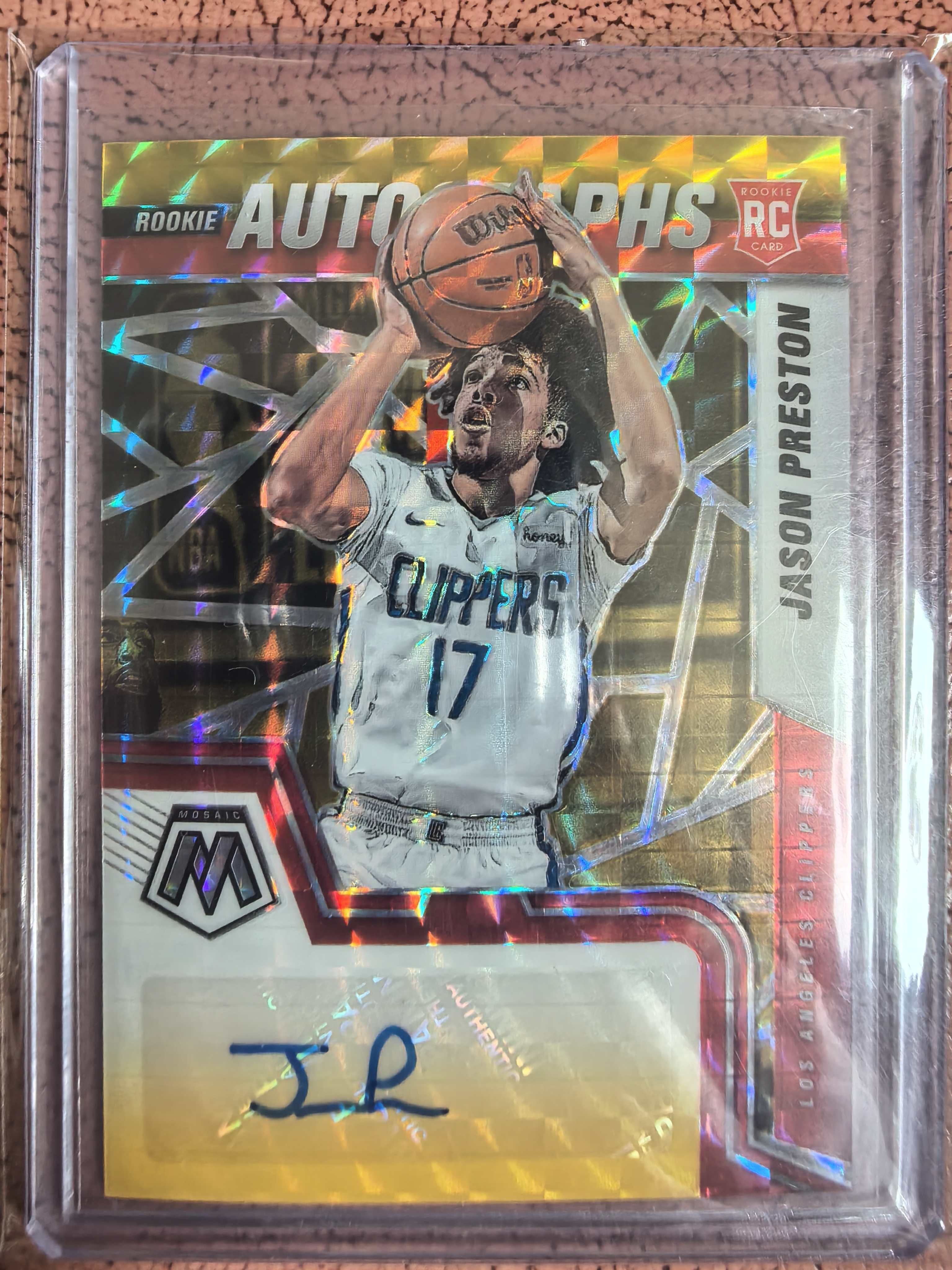 2021-22 Panini Mosaic Jason Preston RC Rookie Autographs Mosaic - Choice Fusion Red & Yellow Prizm