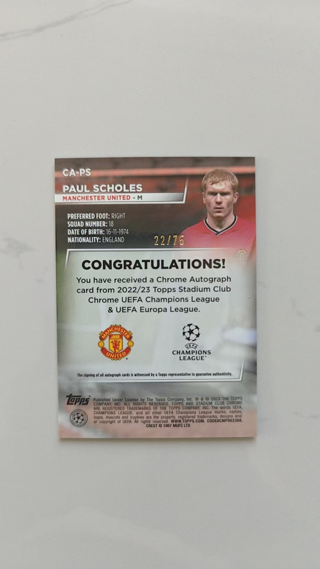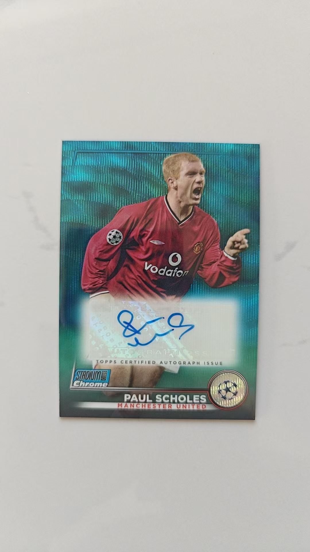 2022-23 Topps Stadium Club Chrome Paul Scholes 保罗·斯科尔斯 曼联 英格兰 洋葱头 带编签字 22/75 蓝波纹折 墨迹完美 欧冠竞技场正系列 传奇巨星