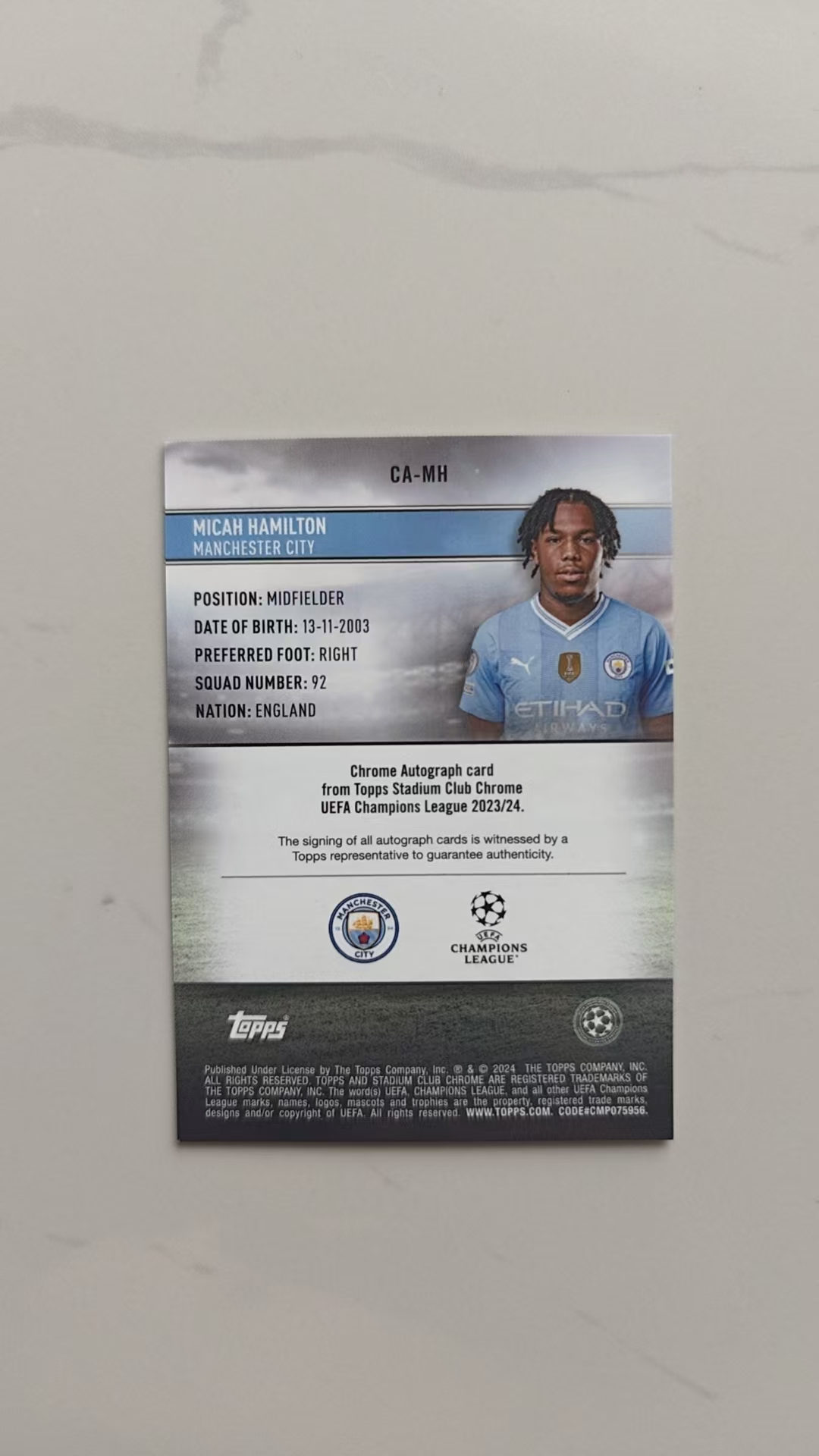 2023-24 Topps Stadium Club Chrome Micah Hamilton RC 米卡·汉密尔顿 曼城 英格兰 新秀 签字 墨迹完美 欧冠竞技场正系列