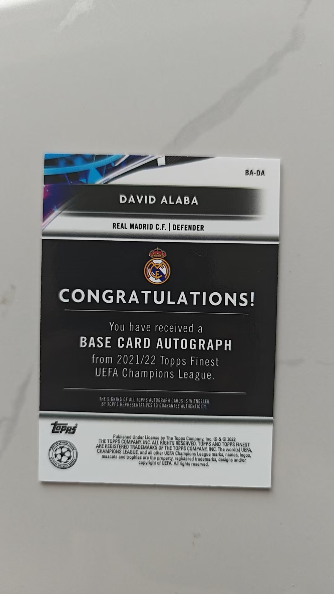 2021-22 Topps Finest David Alaba 戴维·阿拉巴 皇马 奥地利 刘星 签字 墨迹完美 欧战正系列