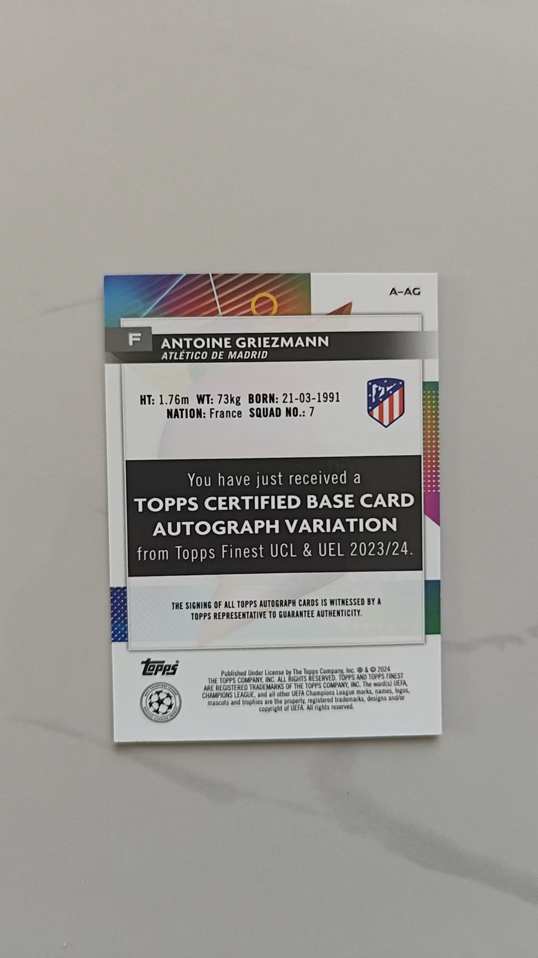 2023-24 Topps Finest Antoine Griezmann 安托万·格列兹曼 安托万·格里兹曼 马竞 法国 格子 带编签字 043/150 蓝折 墨迹完美 欧战正系列