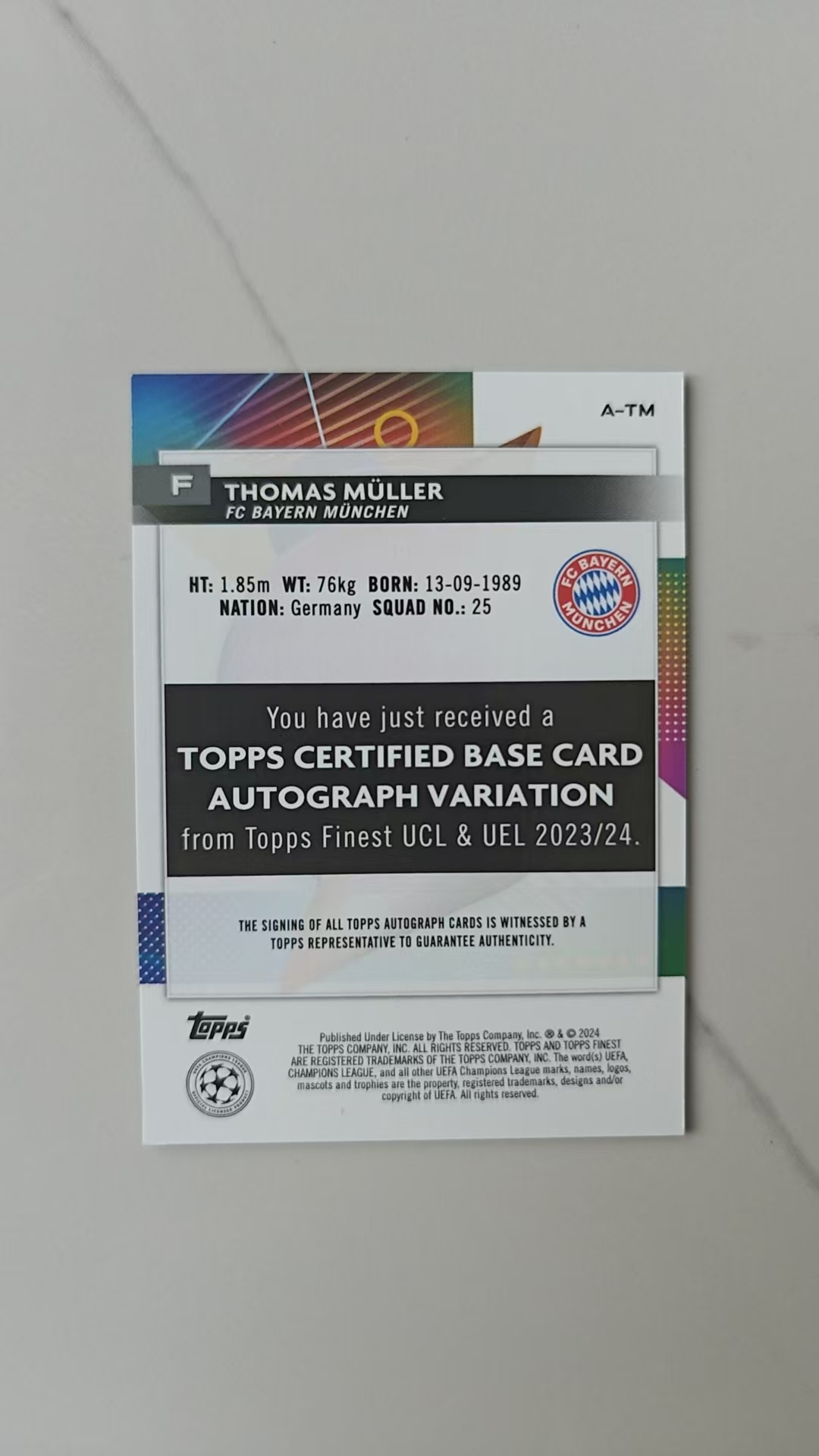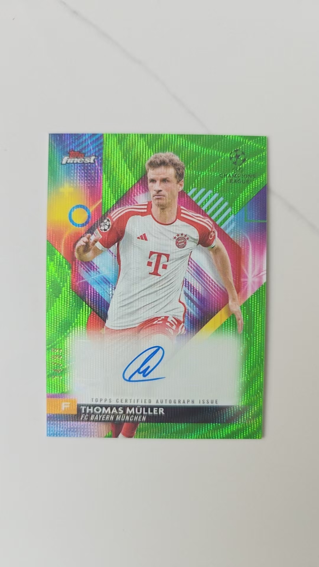 2023-24 Topps Finest Thomas Muller 托马斯·穆勒 拜仁 德国 二娃 带编签字 34/99 绿波纹折 绿折 墨迹完美 欧战正系列 温哥华白浪