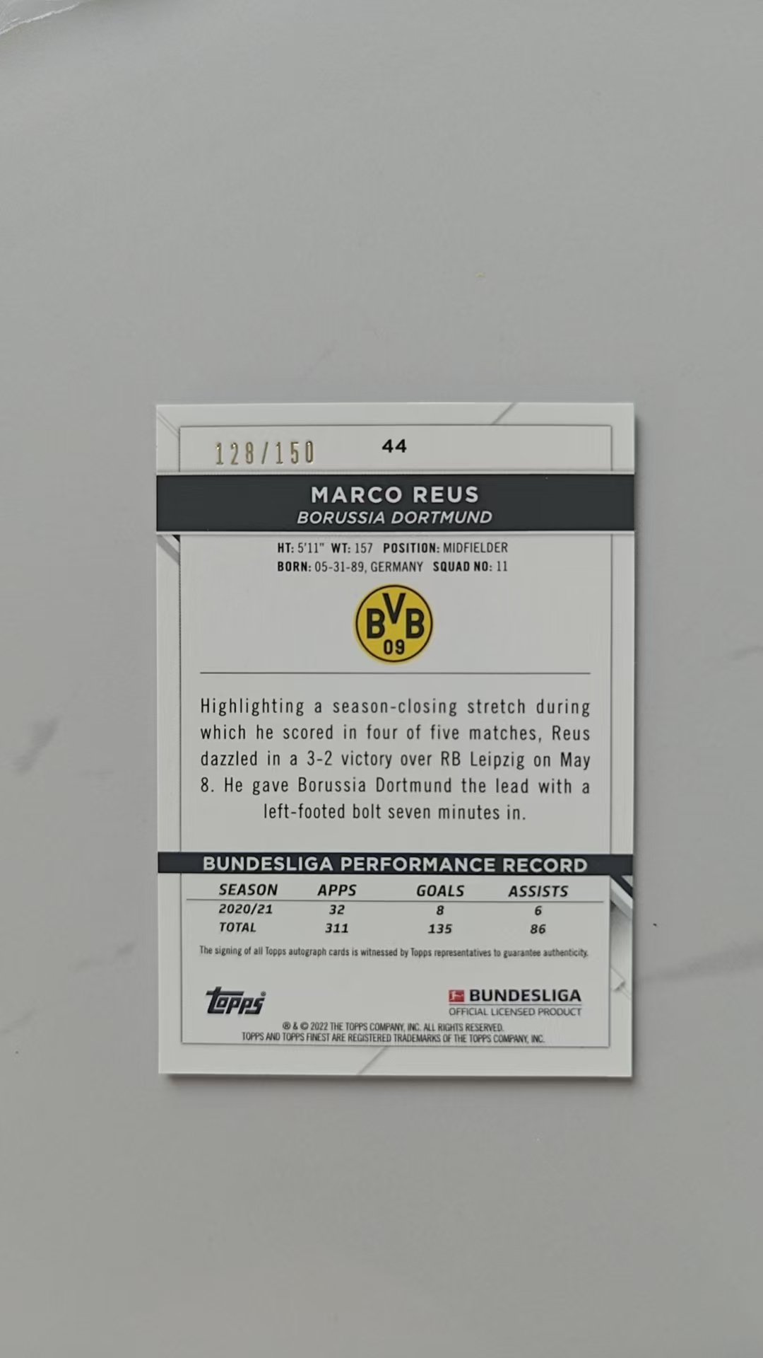 2021-22 Topps Finest Bundesliga Marco Reus 马尔科·罗伊斯 多特蒙德 德国 小火箭 带编签字 128/150 黑折 墨迹完美 德甲 洛杉矶银河