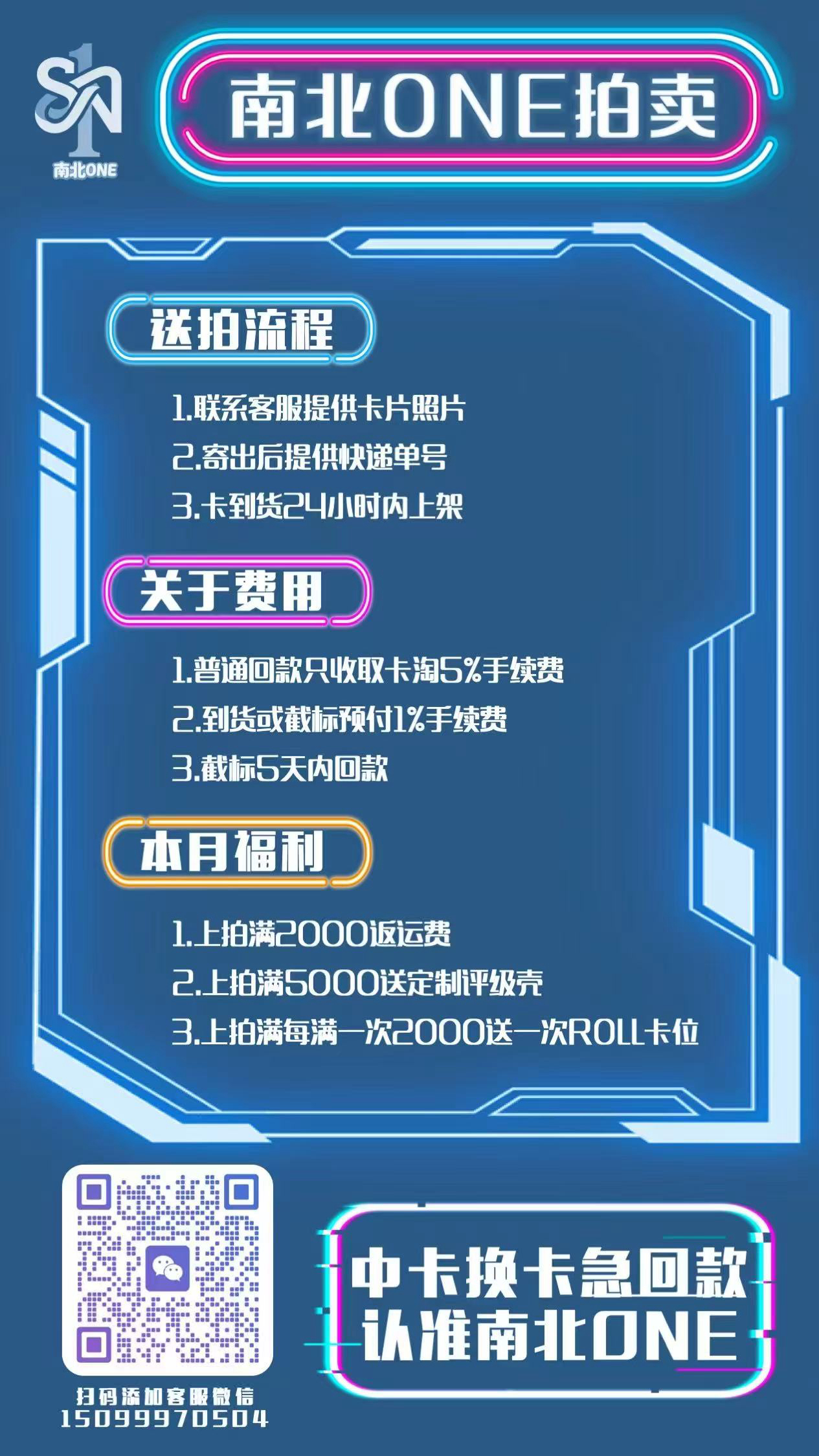 如需代卖服务请占站内私信 低手续费 急速回款预付60-80%竞拍前请卡友们认真观看以下规则 出价即视为已阅读规则且认同规则: 一、鸽子0容忍!!! 拍后请于3日内付款 3日内不付款将申请投诉封号 不接受任何理由延时付款或重启订单 二、快递发货【不累计!】【不到付!】 付款后72小时内发货 会在规定时间内发货 各位老板无需着急 如需修改地址需先提供【提货码】不提供提货码按默认地址发出本店只发【顺丰寄付 不到付 不累计】 超重另算 介意勿拍 默认无保价服务 高价值卡如需保价请联系站内信或客服【买家拆快递请录制开箱视频】 快递如出现破损、暴力变形、遗失等问题 请自行联系客服理赔 如无开箱视频无法配合维权 售后问题请在订单完成交易之前提出申请 已完成交易订单不再提供售后服务 三、关于卡品 卡品如图 一般通行品以上 如无说明则为通行品 如有瑕疵会提供文字说明 请把图片看清国宝imm等系列厚卡 老卡有白边白角属于正常通行品相 镜面卡签有小划痕属于正常通行品相 出厂印刷线属正常通行品相 评级卡砖上的划痕和破损不属于品相问题 折射系列不保证金标p10 要评级追求金标p10者请直接购买金标p10特殊卡种如折射、镜面卡、聚光灯很难有非常完美的卡品 如您追求品相完美请直接购买评级卡【多卡打包lot不保卡品】 四、关于合并订单 所有截标商品 次日合并订单 若有多个已合并订单 请站内或者客服留言 修改运费如果遇到重复收取运费 已收运费却发到付等运费问题 站内或客服留言会处理返还所有订单拍完后一起付款 先付款的会先发货 五、关于交换版 交换版只邮寄 不发码 站内信客服时间:【中午12:00-晚上11:00】 微信客服时间:【中午12:00-晚上11:00】                           【尊重并热爱每一张卡 珍惜并感恩每一位老板】