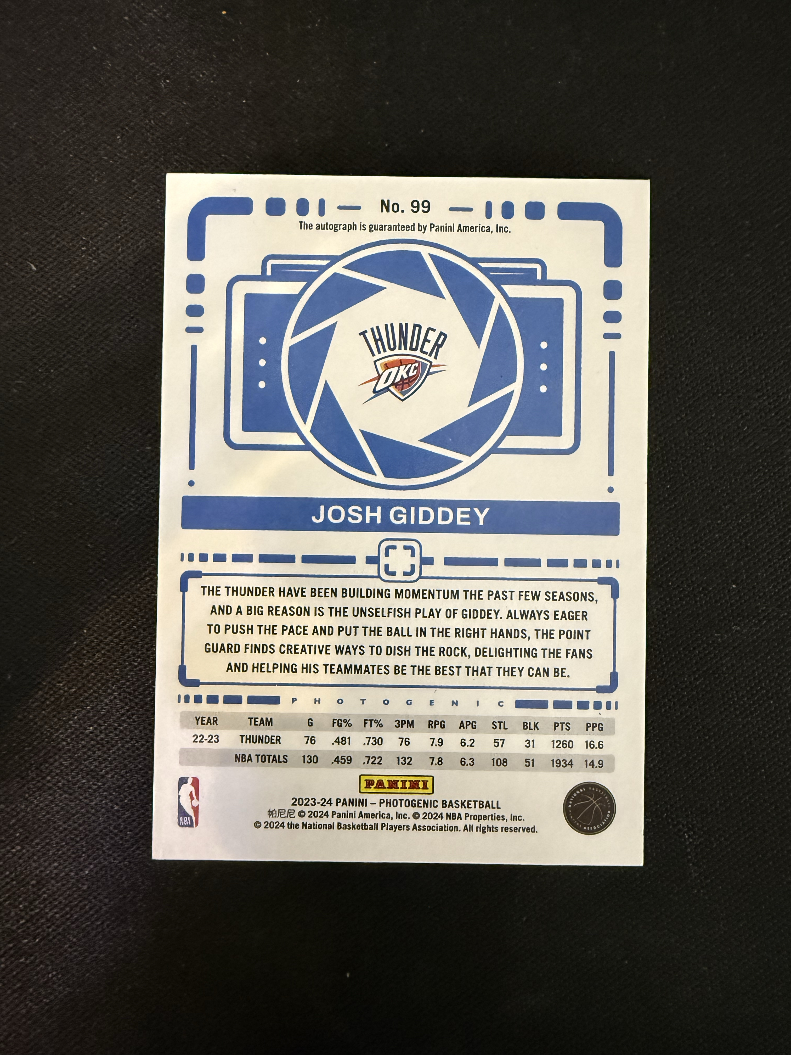 2023-24 Panini PaniniPhotoGenicNBA Josh Giddey 约什 吉迪 雷霆 签字 上篮 墨迹如图 上镜 碎冰折 棱镜折 卡品如图 专收必备