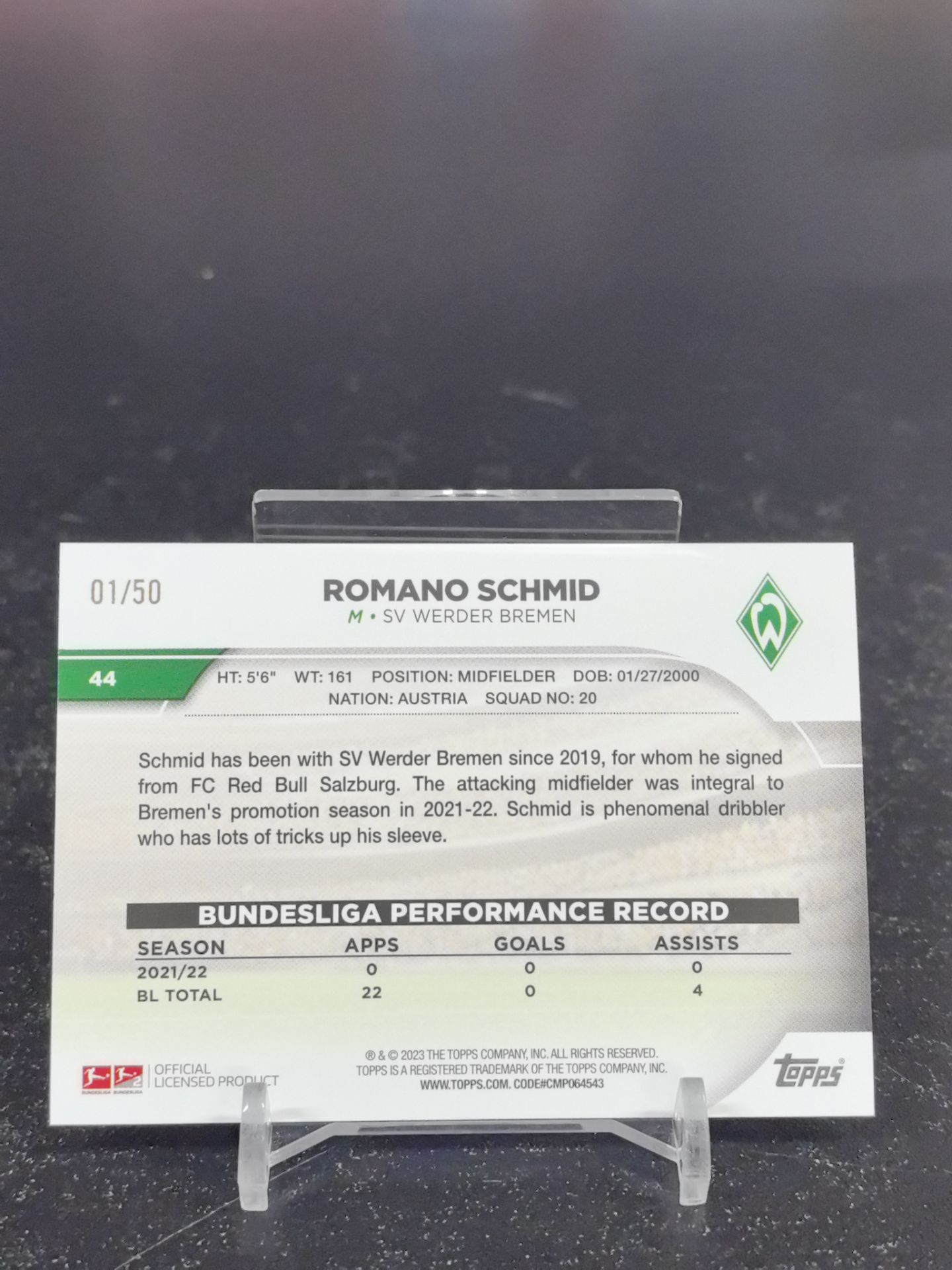 【浩行拍卖 截标预付82%】2023 topps romano schmid 德甲 欧冠 云达不莱梅 罗马诺 施密德 新秀 rc 碧玉折 折射 1/50编 首编 专收必备 瑕疵看图「稳妥218」1103N03紋