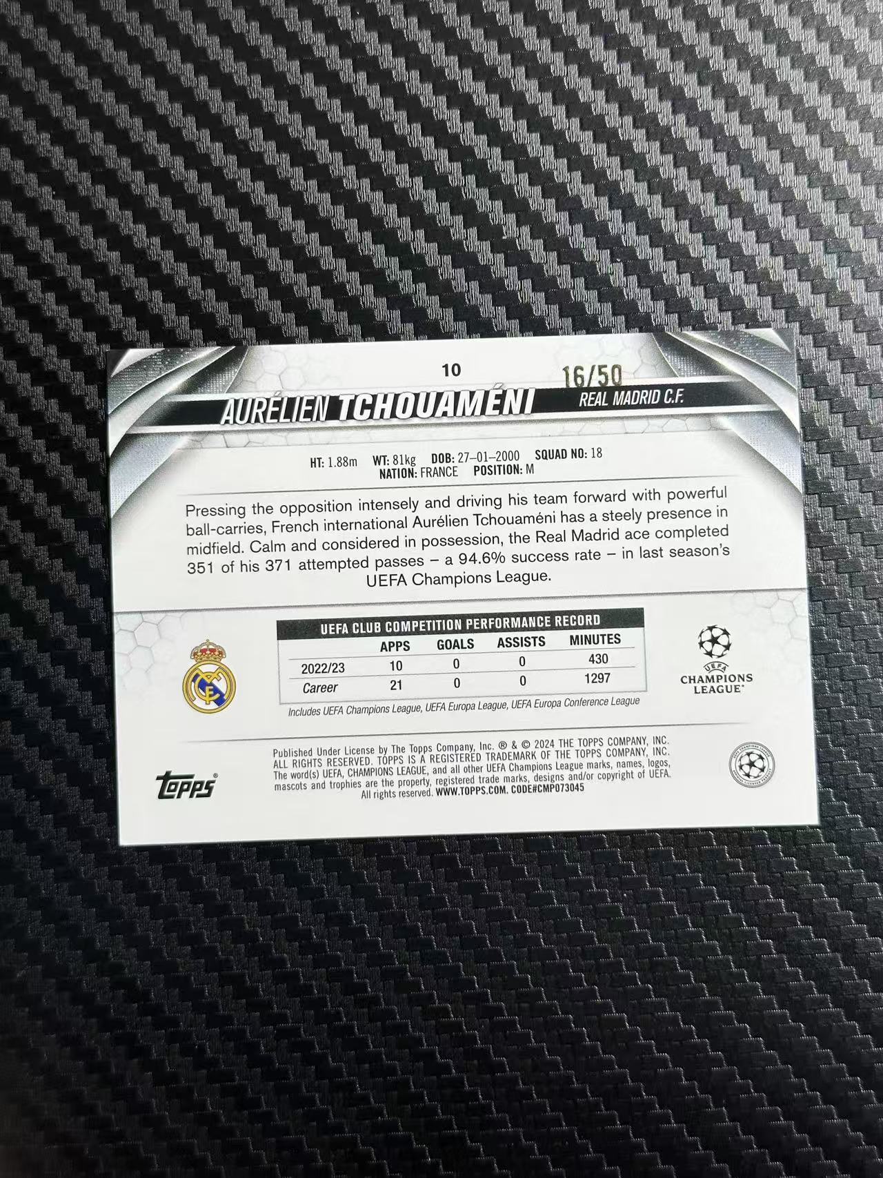 2024 Topps ucc AURELIEN TCHOUAMENI 欧战 碧玉 皇马 皇家马德里 法国 奥雷利安 琼阿梅尼 楚阿梅尼 16/50编 金玉折 卡品如图 拍前看描述