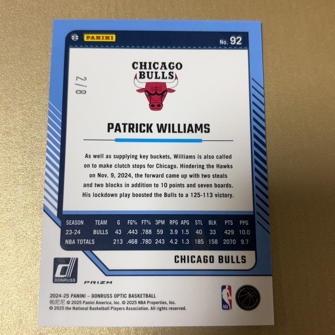 2024-25 Panini donruss optic Patrick Williams 帕特里克 威廉姆斯 杜蕾斯 optic prizm 8编 银脉冲 信封独占 公牛 折射